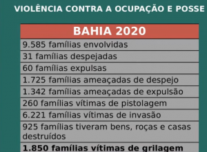 Os números mostram que os conflitos por terra cresceram 25% em âmbito nacional, passando de 1.260, em 2019, para 1.576, em 2020. A Bahia é o terceiro estado em conflitos (26) causados por disputa pela água – atrás de Minas Gerais (125) e do Pará (31) – e o quarto (127) no ranking de enfrentamentos por terra. Pará (245), Maranhão (203), Mato Grosso (166) lideram.