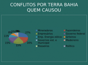 No território baiano, a maioria das disputas foram causadas por mineradoras, fazendeiros, empresários, governo federal e por empresas de energia eólica. De acordo com a CPT, os conflitos não acontecem isoladamente. Eles têm ligação com a soja da região oeste e o minério de ferro da Bamin, em Caetité. Várias empresas querem se estabelecer na região e estão aguardando a conclusão da Ferrovia de Integração Oeste Leste (Fiol).