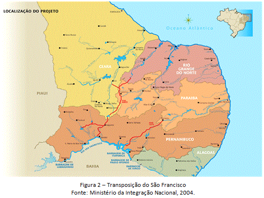 A estiagem acompanhando a história da região semiárida nordestina. Na busca dos problemas reais e de soluções, foram instituídas organizações e políticas públicas, e a mais recente é o projeto governamental de transposição de parte das águas do rio São Francisco, que foi apresentado como alternativa para reduzir a oferta desigual de água na região sertaneja (Brasil-EIA/Rima, 2000). Sua primeira etapa prevê a construção de gigantescas tubulações e canais, num percurso de 1440km de extensão, cujo objetivo, segundo o governo, é dar segurança hídrica a uma população de 12 milhões de pessoas e irrigar o sertão dos estados do Ceará, Rio Grande do Norte, Paraíba e Pernambuco – estados nordestinos.