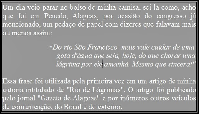 Como Presidente da Associação do Ministério Público de Alagoas em quatro gestões, no início da década passada, tratei de realizar um grande seminário para debater a transposição do rio, na cidade de Penedo, uma das mais belas e antigas de todo o São Francisco - a chamada porta de entrada para o sertão por água. Reunimos, ali, promotores, juízes, a sociedade penedense, pescadores, navegadores, e contamos com a participação do senador alagoano Renan Calheiros, político sempre preocupado com os destinos do outrora rio Opará, como o chamavam os nativos. O parlamentar foi um dos conferencistas do conclave, demonstrando seu total apoio à causa da preservação do rio. Outro conferencista foi o renomado agrônomo, pesquisador e especialistas em águas, Doutor João Suassuna, sobrinho do escritor Ariano Suassuna, e tão importante quanto ele em sua área de atuação. Anos mais tarde, realizamos novo congresso, dessa feita na cidade de Piranhas, situada exatamente no início do baixo São Francisco, entre os municípios de Paulo Afonso, na Bahia, e Canindé do São Francisco, em Sergipe. Ao evento compareceram, do mesmo modo que em Penedo, membros do Ministério Público estadual e federal, integrantes da magistratura, políticos, membros da comunidade local, o político João Alves Filho, atualmente prefeito de Aracaju e um dos maiores estudiosos do rio São Francisco. Novamente o pesquisador João Suassuna se fez presente com toda sua garra, coragem e vontade de contribuir para a sobrevivência do rio São Francisco. Os debates foram extremamente proveitosos.