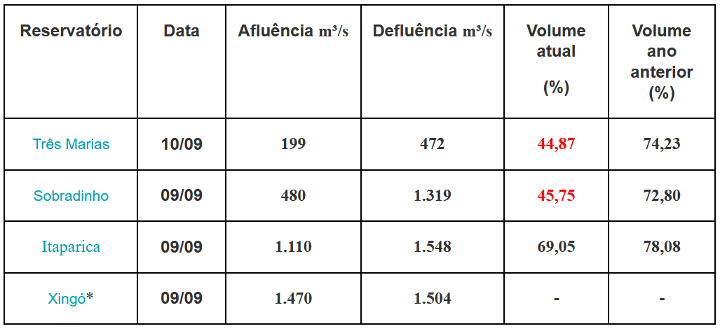 A seguir, são informados os volumes que fluíram na semana em curso (10/09), nos postos de observações volumétricas entre Três Marias e a foz do Velho Chico. A defluência da UHE de Três Marias, que na semana anterior estava em 459 m³/s, na atual subiu para 472 m³/s. No posto de São Romão, que na semana anterior estava com 482 m³/s, na atual subiu para 588 m³/s; no de São Francisco, que na semana anterior estava com 546 m³/s, na atual subiu para 752 m³/s; no de Bom Jesus da Lapa, que na semana anterior estava com 616 m³/s, na atual subiu para 697 m³/s; no posto de Morpará, que na semana anterior estava com 680 m³/s, nessa semana caiu para 662 m³/s; no posto de Juazeiro, que na semana passada estava com 1.193 m³/s, nessa semana subiu para 1.500 m³/s e em Propriá, que na semana anterior estava com 797 m³/s, na atual subiu para 1.181 m³/s.