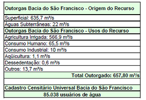 Outra observação que deve ser feita é que a vazão média anual da série 1931-1960 foi reduzida. Era de 2850 m3/s, tendo havido um decréscimo de 144 m3/s, provavelmente devido à crescente exploração da vazão de base, induzida para poços tubulares profundos que são perfurados de forma descontrolada e sem outorga de uso pelo órgão competente, a ANA . Os dados que se transcreve aqui sobre uso de água subterrânea, objeto de outorgas por poços, estão contidos no seguinte trabalho: Usos Múltiplos na Bacia Hidrográfica do Rio São Francisco , Políticas e Prioridades, de autoria do engenheiro hídrico Pedro Antônio Molinas , para o Comitê da Bacia Hidrográfica do Rio São Francisco - CBHSF – AGB Peixe Vivo , em junho/2013. O quadro a seguir mostra, entre outras outorgas, a de água subterrânea .