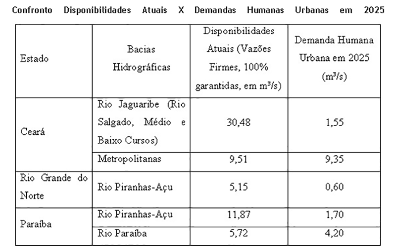 Esta vulnerabilidade existiria manifestada pelo colapso dos sistemas de abastecimento de cidades inseridas na região semiárida nordestina. É uma verdade parcial. Na realidade, os sistemas de abastecimento destas cidades entram em colapso por uma ou pelo conjunto das razões seguintes: inexistência de capacidade de regularização plurianual, 100% garantida, dos reservatórios utilizados como fonte de abastecimento por sua baixa capacidade de acumulação que, para isso e, dependendo das demandas, devem ter capacidade de armazenamento de no mínimo 20 milhões de metros cúbicos de água (há cidades supridas com açudes com capacidade de acumulação máxima em torno de 3 milhões de metros cúbicos, vulneráveis a secas de apenas um ano de duração); falta de gerenciamento destes reservatórios , usando-os além de suas capacidades de regularização 100% garantida ou, ainda, obsolescência do sistema de abastecimento. Nunca, porém, por falta de água nas respectivas bacias hidrográficas locais. É o que demonstram as respostas das Secretarias Estaduais de Recursos Hídricos , respostas estas contidas no Ofício Nº 373/MI, datado de 16/09/2005, do Ministério da Integração Nacional dirigido à Agência Nacional de Águas - ANA , no qual estas Secretarias informam as vazões 100% garantidas de reservatórios localizados nas bacias receptoras que poderiam suprir as demandas estimadas para o ano de 2025, com a segurança requerida, dos 12 milhões de habitantes urbanos de cidades inseridas na região semiárida, inclusive Fortaleza/Ceará e Campina Grande , na Paraíba . O quadro abaixo sintetiza as informações, contidas no referido Ofício.