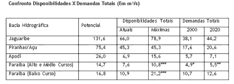Esclareço que o que se denomina de Potencial é a vazão média de longo período, e Disponibilidades , a vazão que se pode, com segurança (100% garantida, qualquer que seja o evento hidrometeorológico posterior), dispor anualmente em reservatórios superficiais (maior parte) e pela exploração, por poços, das águas armazenadas e em circulação nos rios intermitentes de cada bacia.