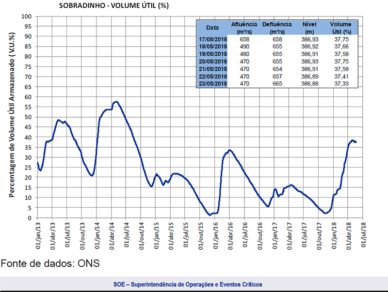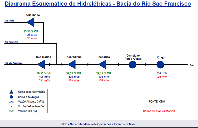 Esta previsão de nível zero nos dois reservatórios considerados no quadro acima, não se concretizou porque reduziram as defluências, progressivamente, até atingir os níveis de descarga para os 665 m3/s e 158 m3/s atuais, praticados em Sobradinho e Três Marias , respectivamente, conforme dados do Boletim da Sala de Situação do dia 23/05/2018, apresentado a seguir: