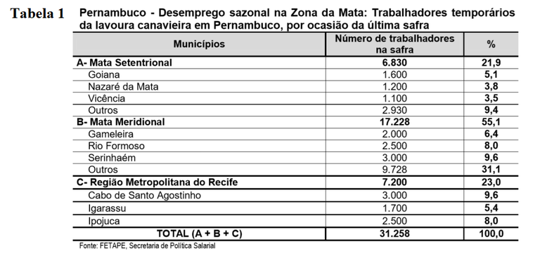 A pesquisa “Desemprego Sazonal na Atividade Açucareira Pernambucana: Zona Da Mata e Região Metropolitana do Recife”, conduzida e desenvolvida pela Coordenação Geral de Estudos Econômicos e Populacionais (CGEP) da Diretoria de Pesquisa (DIPES) da Fundação Joaquim Nabuco tem como tema central o estudo do fenômeno do Desemprego Sazonal em áreas da atividade açucareira, mais especificamente na Zona da Mata pernambucana e em alguns municípios da RMR que têm expressiva produção de cana-de-açúcar.