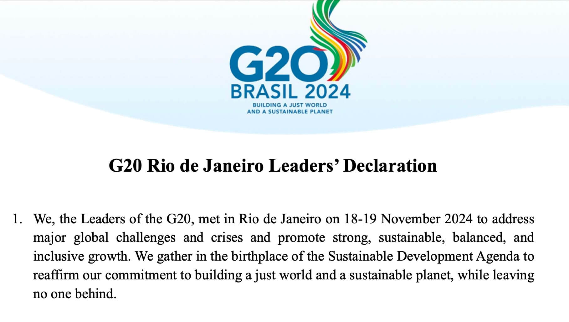 The leaders of the G20 met in Rio de Janeiro on 18-19 November, 2024, to address major global challenges and crises and promote strong, sustainable, balanced and inclusive growth. In the city that is the birthplace of the Sustainable Development Agenda, leaders reaffirmed their commitment to building a fair world and a sustainable planet, prioritizing the fight against inequalities in all their dimensions, without leaving anyone behind. The Rio de Janeiro Leaders' Declaration establishes actions towards concrete results, based on the priorities of the Brazilian G20 presidency: (i) social inclusion and the fight against hunger and poverty; (ii) sustainable development, energy transitions and climate action; and (iii) the reform of global governance institutions. The document also enshrines the achievements of the Brazilian presidency throughout the year, such as the Global Alliance against Hunger and Poverty, the Task Force on a Global Mobilization against Climate Change and the Call to Action on Global Governance Reform.