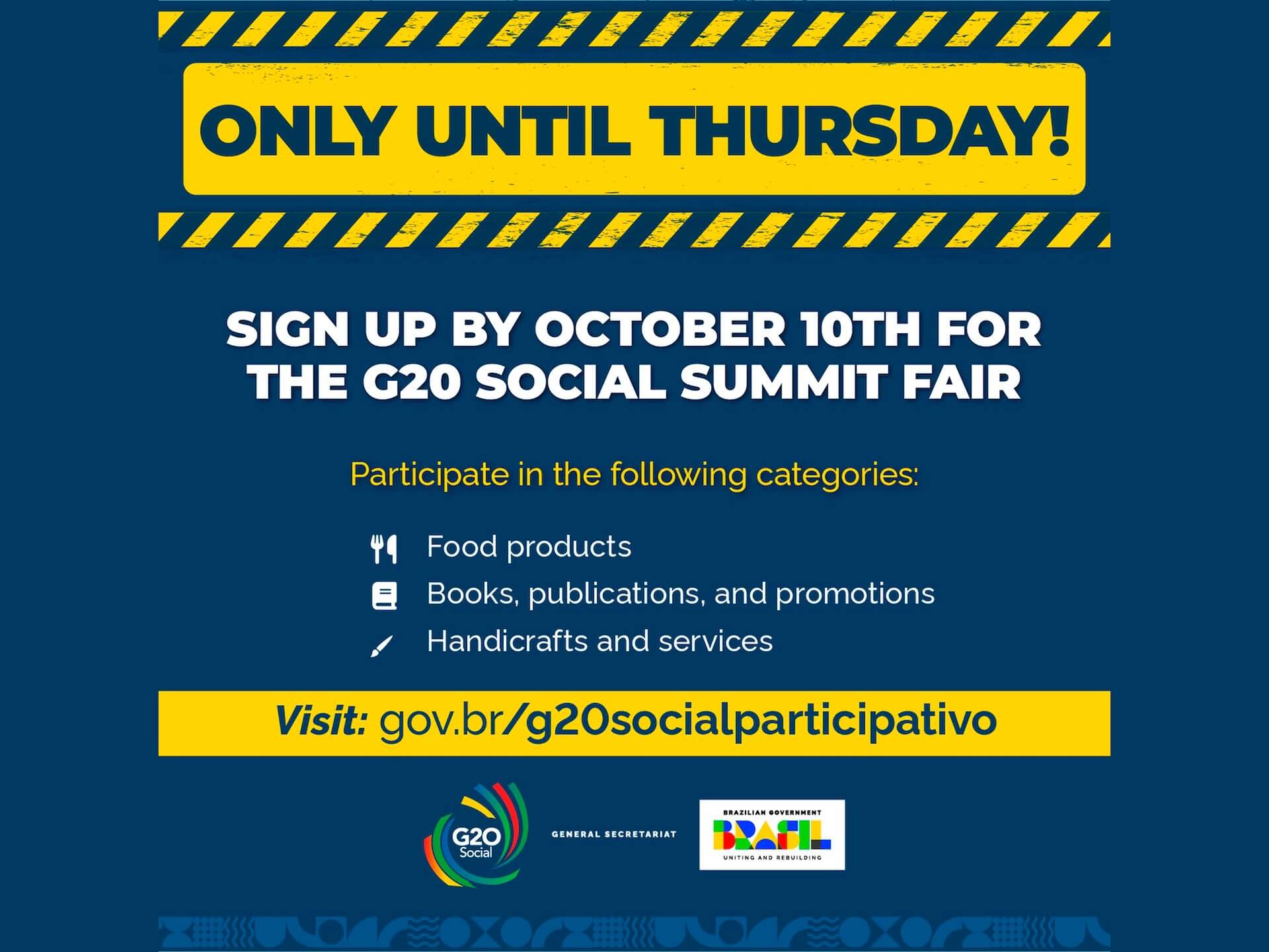 Registrations are available in three categories: Food products and services, Books, publications and promotion, and Handicrafts and services. The G20 Social Summit fairs will take place in Rio de Janeiro on November 14th, 15th, and 16th, 2024, with the pedagogical purpose of demonstrating that citizens are already experiencing the macro alternatives proposed by Brasil.