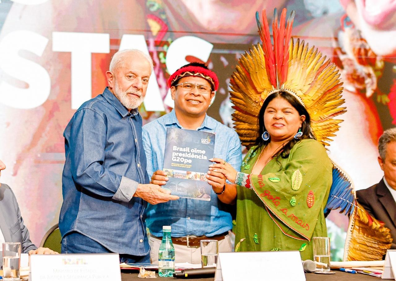Reportero: Al son del himno nacional brasileño, interpretado por Djuena Tikuna, cantante del Amazonas considerada una de las mayores referencias en música indígena en el país, se realizó en Brasilia la ceremonia solemne de investidura de los consejeros y consejeras del Consejo Nacional de Política Indigenista, retomado por el actual gobierno. Durante el evento, el presidente de la República de Brasil, Luiz Inácio Lula da Silva, recibió un ejemplar del e-book Brasil en la presidencia del G20. La entrega la realizaron la ministra de los Pueblos Indígenas, Sonia Guajajara, y Eliel Benites, indígena de la etnia Guarani-Kaiowá. Este último, fue el responsable del trabajo de traducción del primer libro digital del G20 a una lengua indígena – el guaraní.