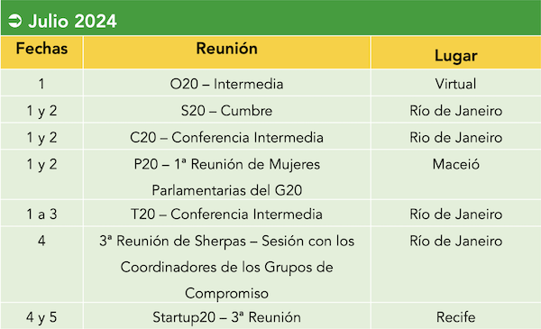 Eventos sectoriales, reuniones inaugurales y cumbres de carácter internacional. El Calendario del G20 Social, que contempla 13 grupos de compromiso, en los más diversos temas y diferentes estructuras de participación, tiene ahora su agenda de eventos recopilada en la página web oficial del G20, facilitando el acceso a quienes acompañan los movimientos de la sociedad civil organizada junto al foro de las mayores economías del mundo.