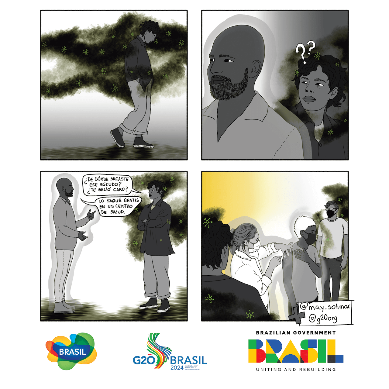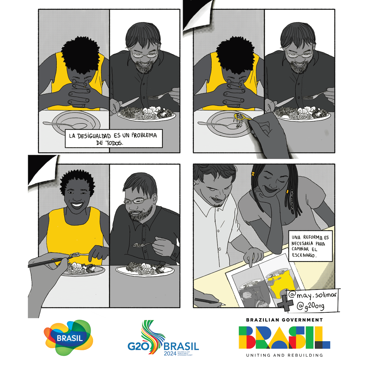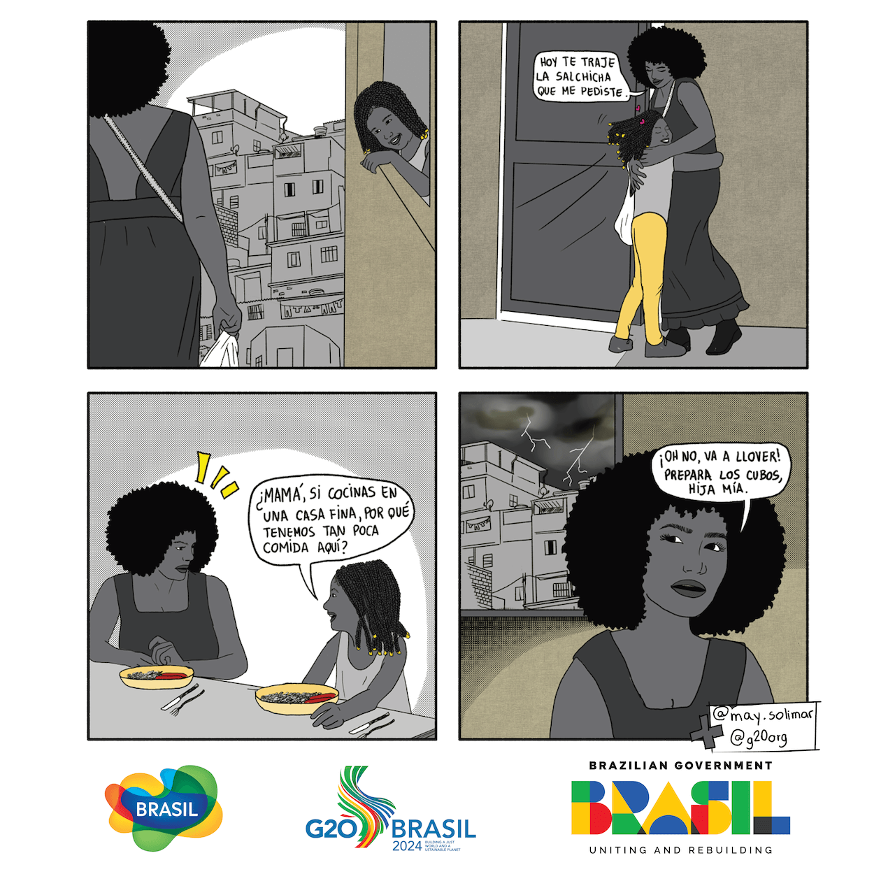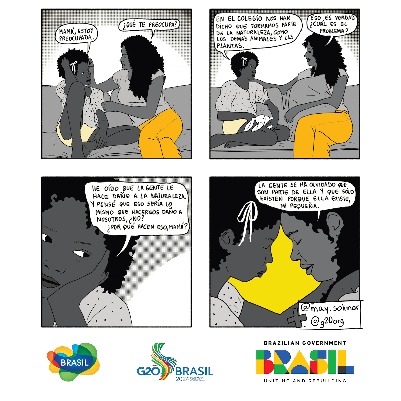 Temas como el clima, la sostenibilidad, el empleo, la economía global y la lucha contra las desigualdades, el hambre y la pobreza están en el centro de los debates globales y también pueden abordarse de forma sencilla y divertida. Esta es la propuesta del G20 en Cómics, en colaboración con May Solimar, publicista, diseñadora, ilustradora y dibujante de cómics. Las historietas de May relatan escenas cotidianas desde la perspectiva de una madre negra que vive en São Paulo, una de las ciudades más grandes de Brasil, y llaman la atención sobre cuestiones como las desigualdades sociales, raciales y de género, la lucha contra el cambio climático y la defensa de los derechos humanos, temas prioritarios de la presidencia brasileña del G20.