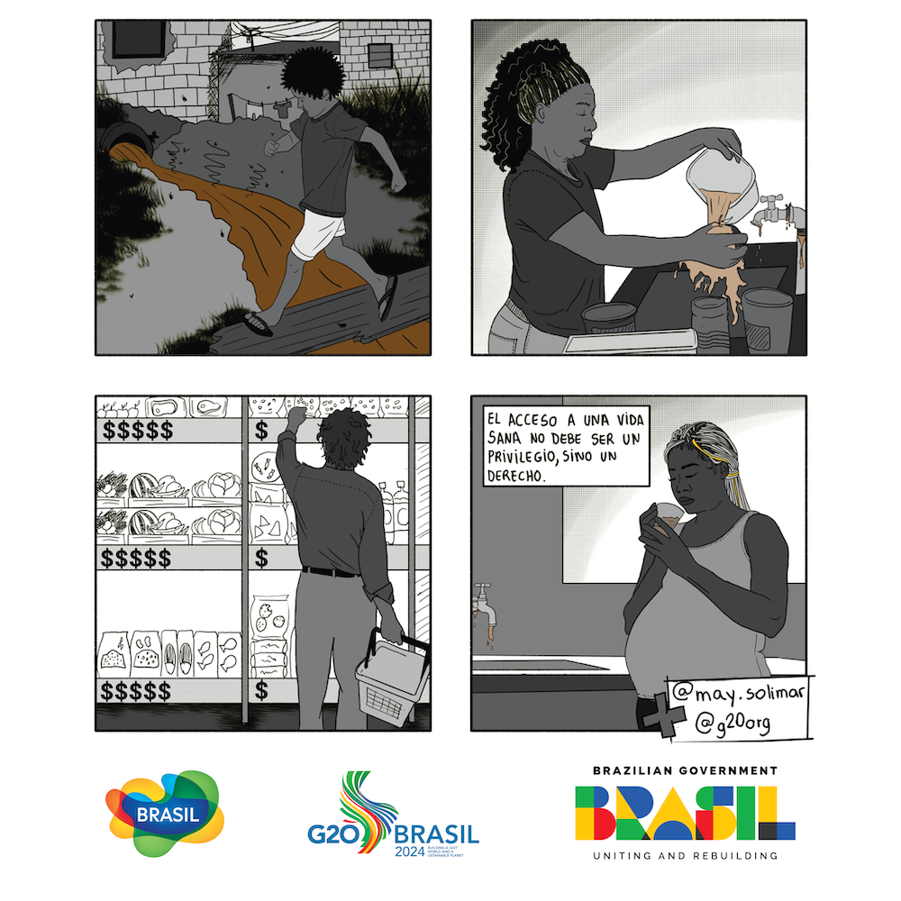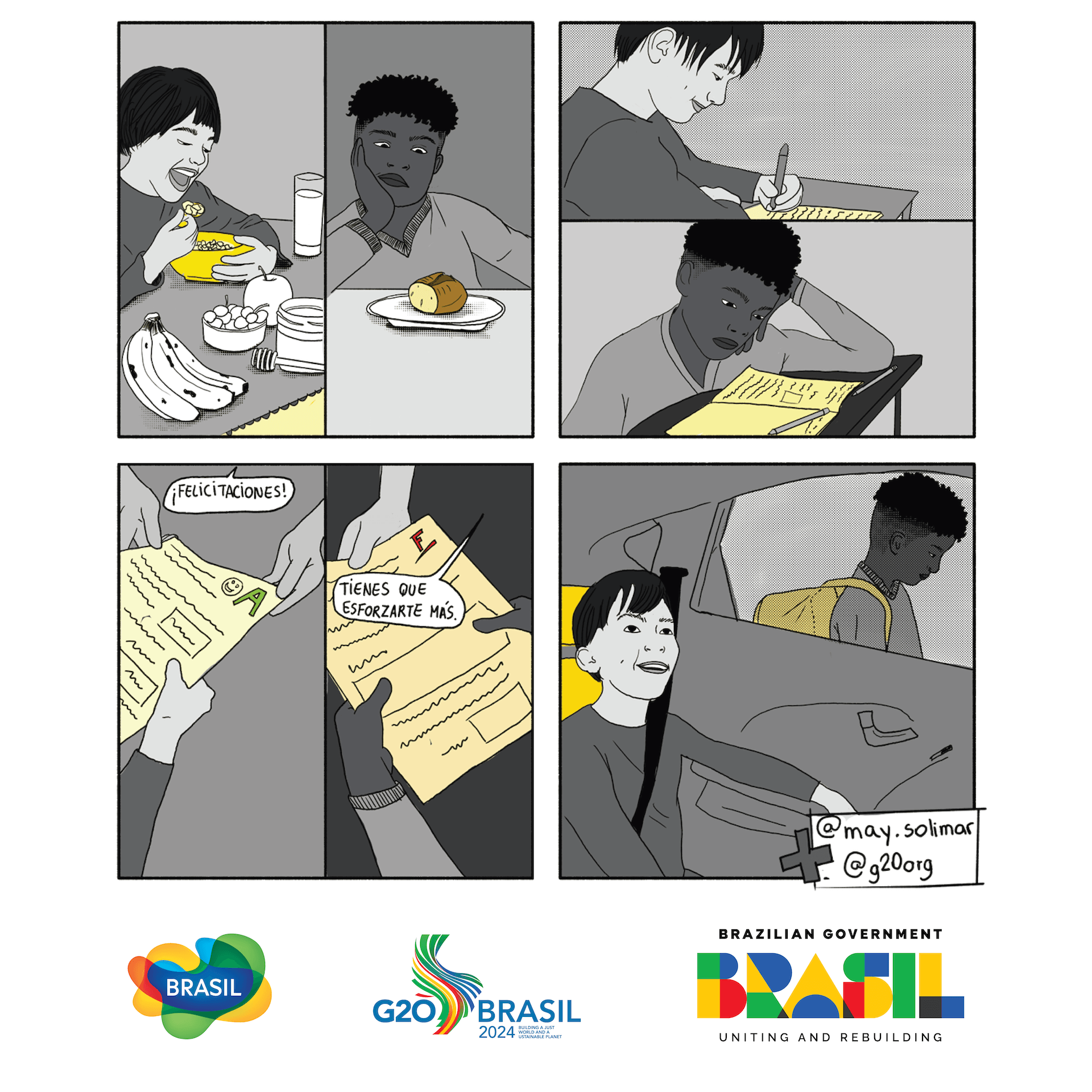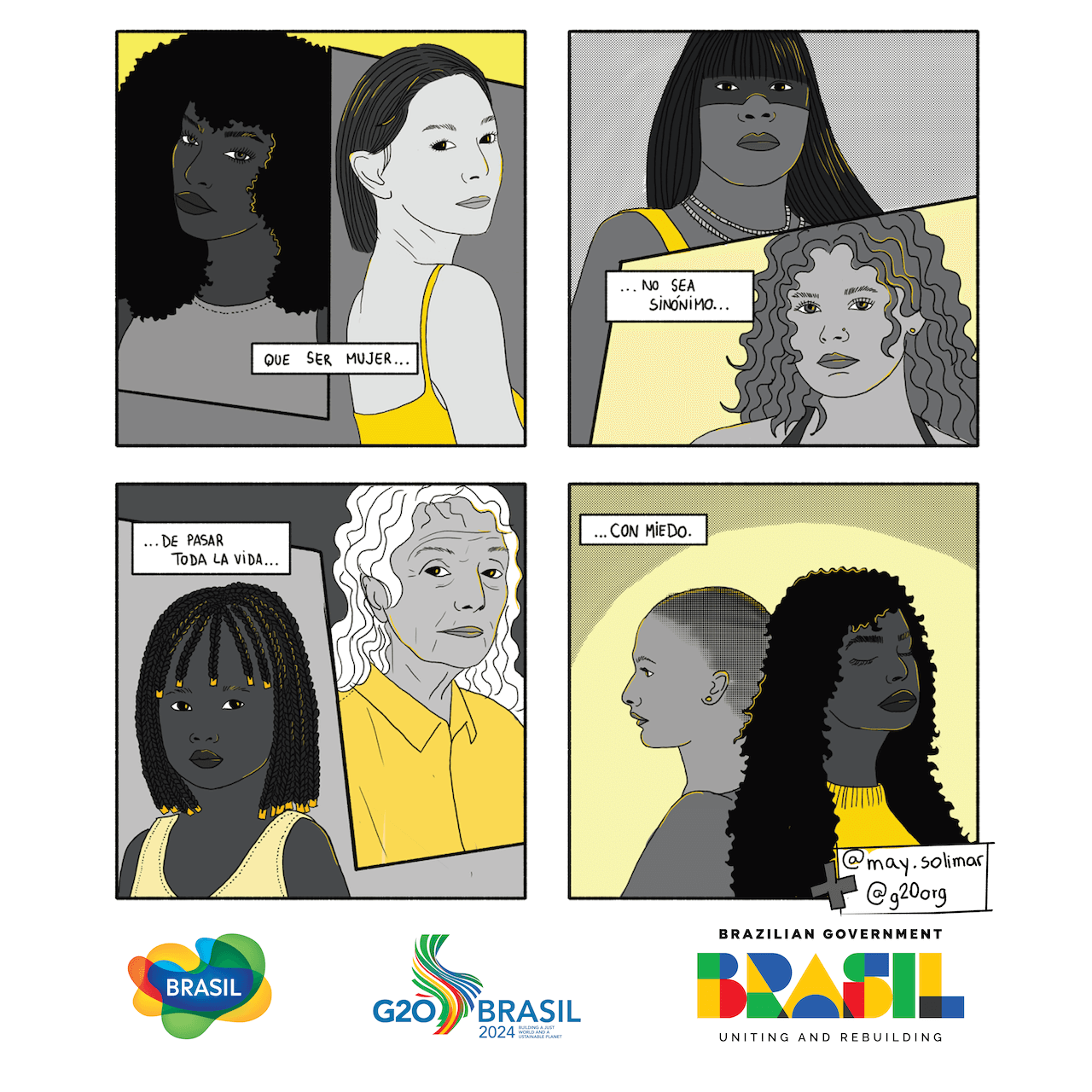 Temas como el clima, la sostenibilidad, el empleo, la economía global y la lucha contra las desigualdades, el hambre y la pobreza están en el centro de los debates globales y también pueden abordarse de forma sencilla y divertida. Esta es la propuesta del G20 en Cómics, en colaboración con May Solimar, publicista, diseñadora, ilustradora y dibujante de cómics. Las historietas de May relatan escenas cotidianas desde la perspectiva de una madre negra que vive en São Paulo, una de las ciudades más grandes de Brasil, y llaman la atención sobre cuestiones como las desigualdades sociales, raciales y de género, la lucha contra el cambio climático y la defensa de los derechos humanos, temas prioritarios de la presidencia brasileña del G20.