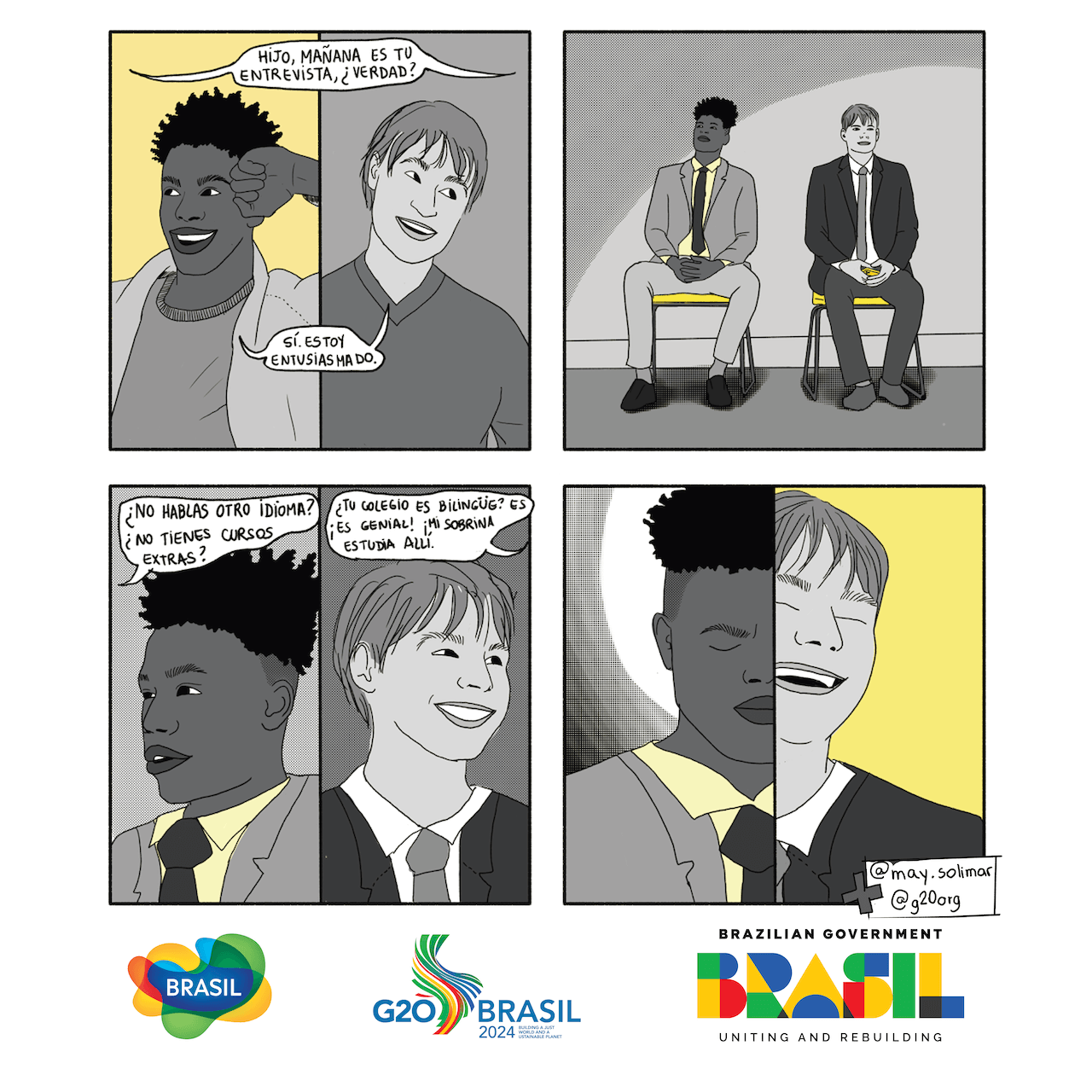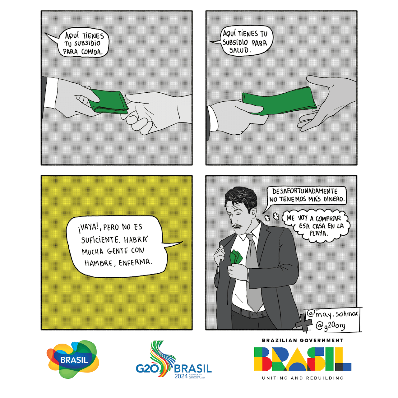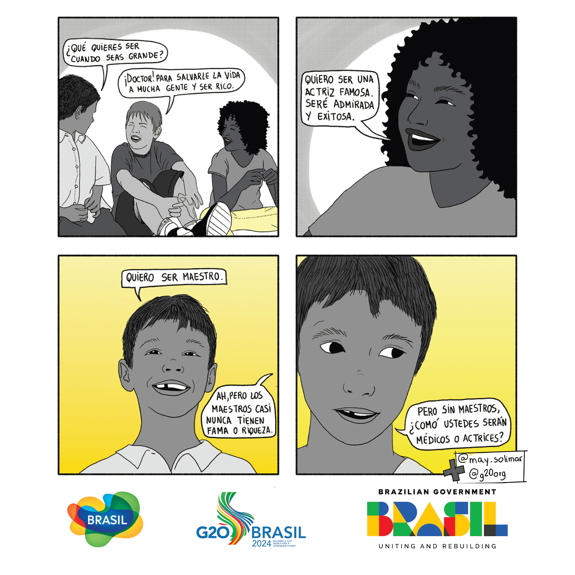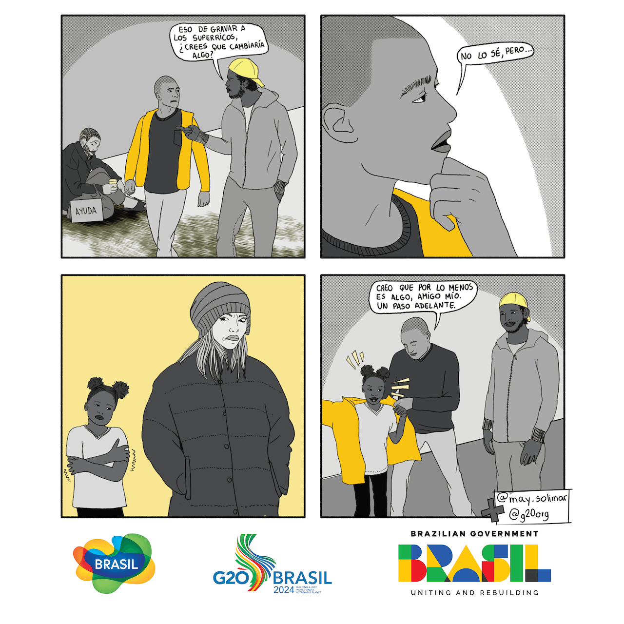 Temas como el clima, la sostenibilidad, el empleo, la economía global y la lucha contra las desigualdades, el hambre y la pobreza están en el centro de los debates globales y también pueden abordarse de forma sencilla y divertida. Esta es la propuesta del G20 en Cómics, en colaboración con May Solimar, publicista, diseñadora, ilustradora y dibujante de cómics. Las historietas de May relatan escenas cotidianas desde la perspectiva de una madre negra que vive en São Paulo, una de las ciudades más grandes de Brasil, y llaman la atención sobre cuestiones como las desigualdades sociales, raciales y de género, la lucha contra el cambio climático y la defensa de los derechos humanos, temas prioritarios de la presidencia brasileña del G20.