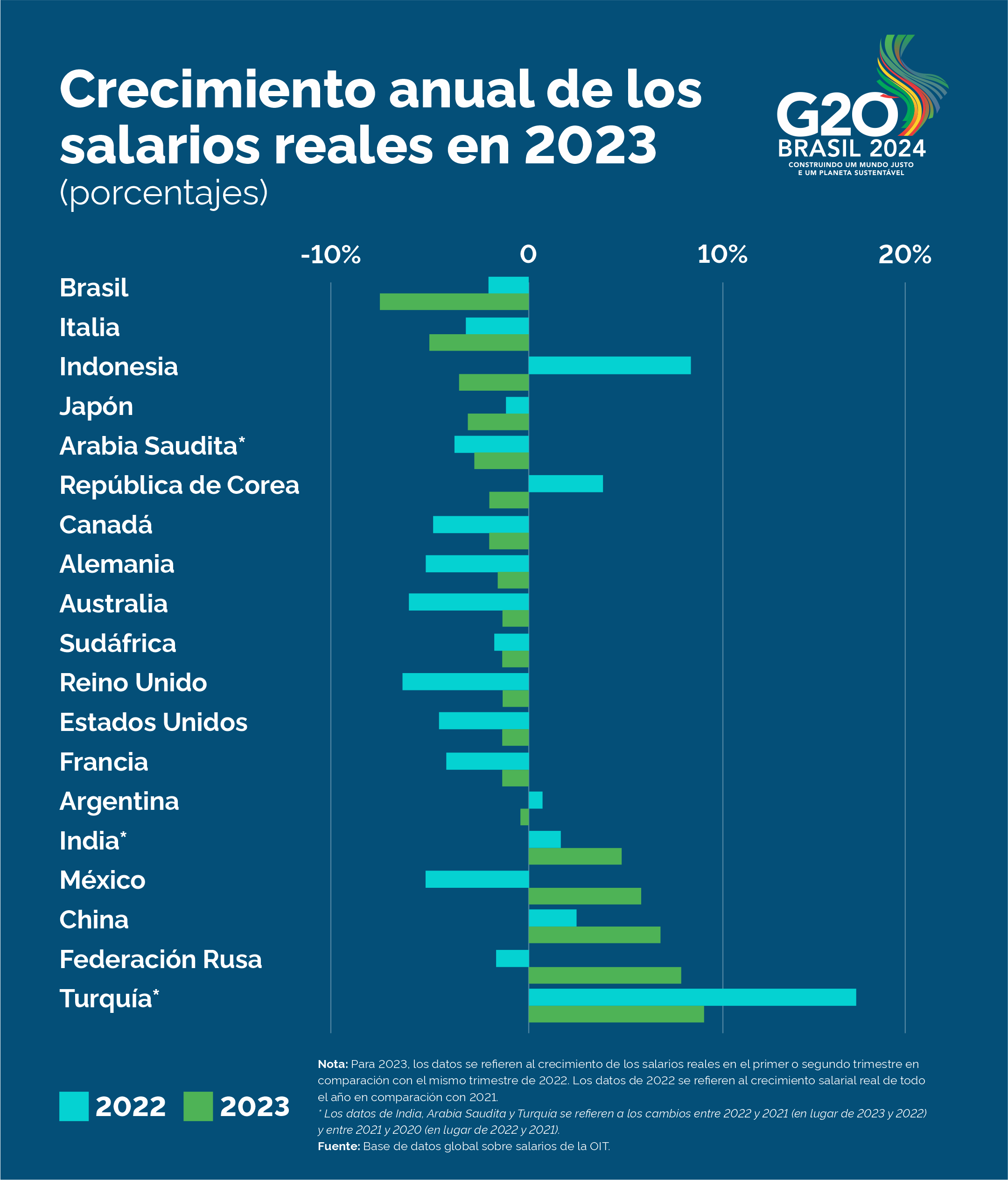 Entre los países del G20, solo China, Rusia y México registraron un crecimiento salarial real en 2023. El año pasado, tanto China como Rusia también lograron uno de los mayores crecimientos de productividad entre los países miembros. En los demás países, los trabajadores experimentaron una disminución en el valor de la remuneración real. Esta reducción fue aún más acentuada en Brasil (6,9%), en Italia (5%) y en Indonesia (3,5%).
