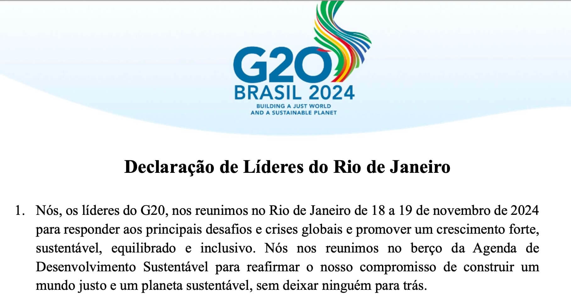 Os líderes do G20 reuniram-se no Rio de Janeiro, de 18 a 19 de novembro de 2024, para enfrentar os principais desafios e crises globais e promover um crescimento forte, sustentável, equilibrado e inclusivo. Na cidade que é o berço da Agenda de Desenvolvimento Sustentável, os líderes reafirmaram o compromisso de construir um mundo justo e um planeta sustentável, priorizando o combate às desigualdades em todas as suas dimensões, sem deixar ninguém para trás. A Declaração de Líderes do Rio de Janeiro estabelece ações em direção a resultados concretos, com base nas prioridades da presidência brasileira do G20: (i) inclusão social e combate à fome e à pobreza; (ii) desenvolvimento sustentável, transições energéticas e ação climática; e (iii) a reforma das instituições de governança global. O documento também consagra as conquistas alcançadas pela presidência brasileira ao longo do ano, como a Aliança Global contra a Fome e a Pobreza, a Força-Tarefa para a Mobilização Global contra a Mudança do Clima e o Chamado à Ação para Reforma da Governança Global.