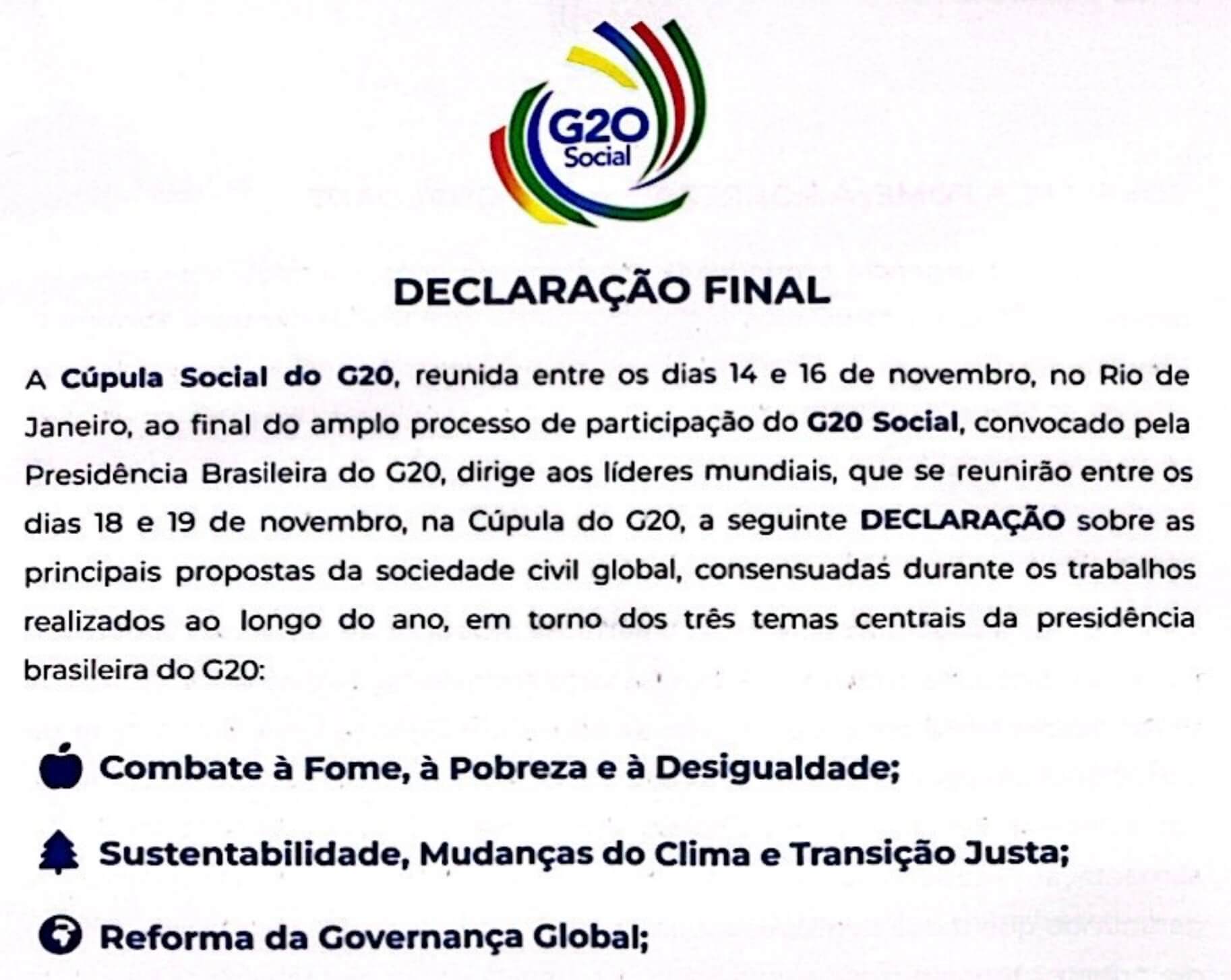 Como um país plural, diverso e com autoridade para tratar de questões fundamentais, como a mudança climática e combate à fome e à pobreza, o G20 Social garante espaço para as diferentes vozes, lutas e reivindicações das populações e dos agentes não-governamentais dos países que compõem as maiores economias do mundo. Assim, o G20 Social pretende que as colaborações da sociedade civil sejam analisadas e, no que couber e houver consenso, incorporadas à Declaração de Líderes.