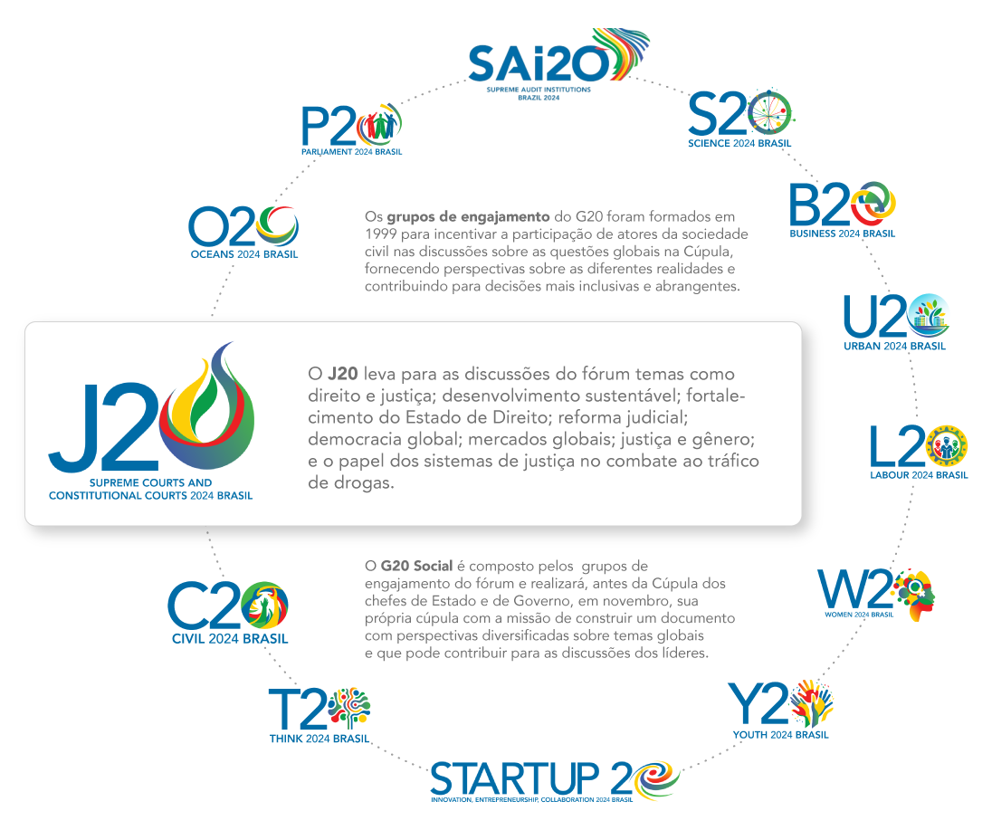 G20 Social, uma das inovações da presidência brasileira do bloco, estimula a participação da sociedade civil nas discussões para fortalecer a democracia no mundo. Um deles, o J20, constituído pelos Supremos Tribunais e Tribunais Constitucionais dos países-membros, promove os princípios jurídicos fundamentais para a proteção dos direitos humanos no mundo.