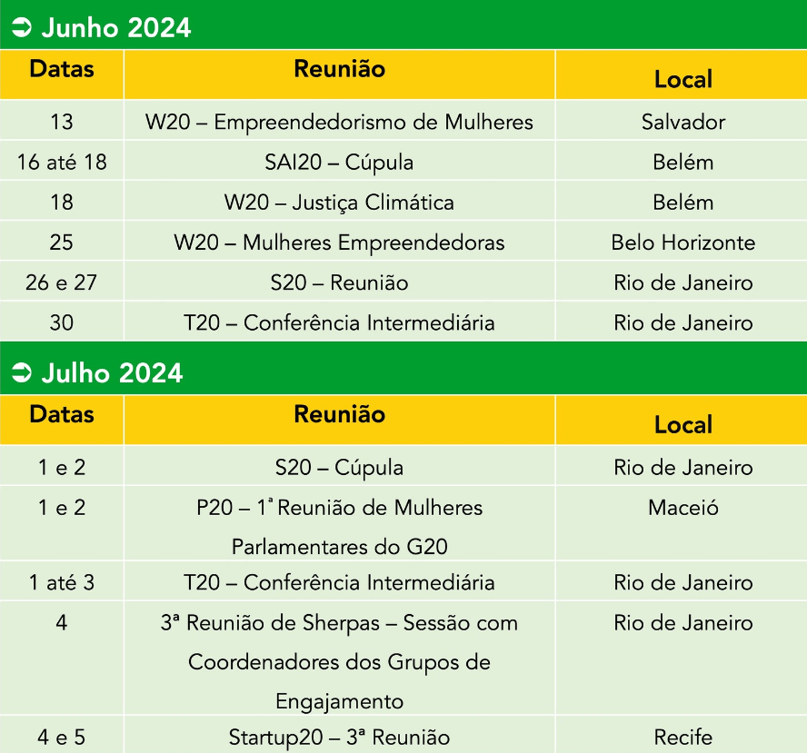 O Calendário de atividades do G20 Social pode ser acessado na íntegra aqui. Mais informações sobre as agendas podem ser acessadas pelas redes ou sites dos próprios grupos de engajamento.
