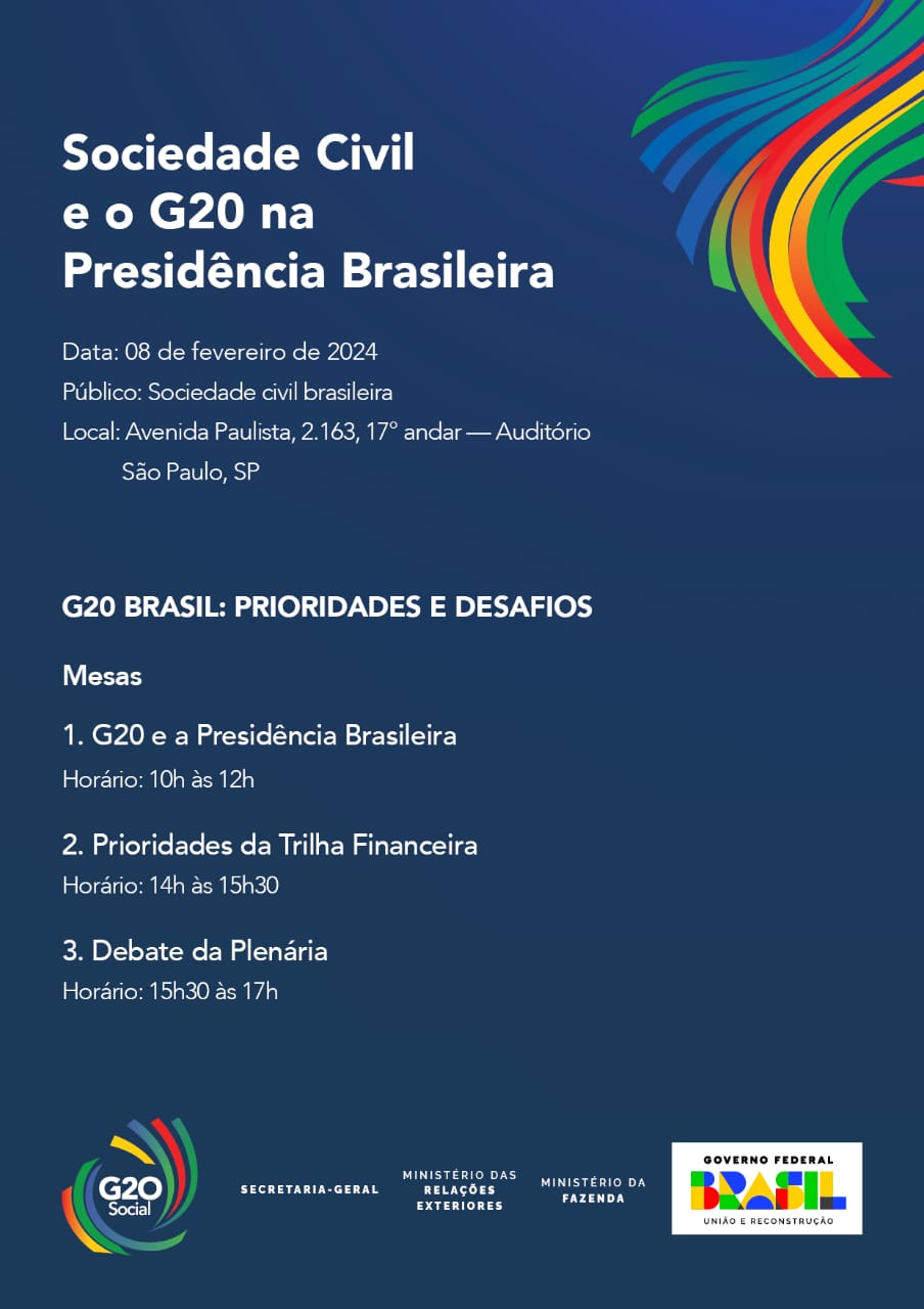 O evento “G20 Brasil: prioridades e desafios” reunirá, de forma inédita, a Trilha de Finanças, representantes da sociedade civil e os grupos de engajamento do G20 Social - são 13 os grupos, que atuam em temáticas sociais diversas. O debate terá transmissão ao vivo pelo canal no youtube do Ministério da Fazenda.