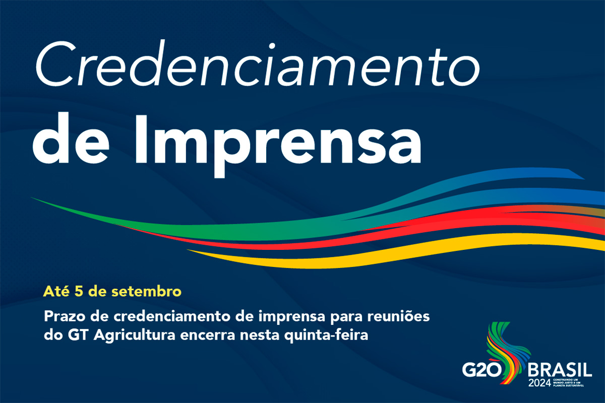 Os veículos de comunicação e os profissionais de imprensa que realizarão a cobertura das reuniões do Grupo de Trabalho de Agricultura do G20 Brasil, que será realizada no estado de Mato Grosso, de 10 a 14 de setembro, precisam realizar o credenciamento até esta quinta-feira (05).
