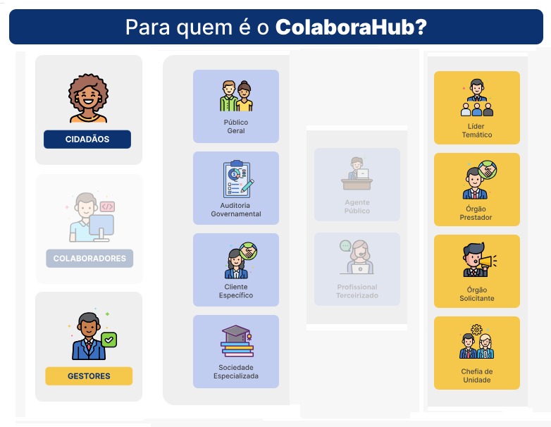 Durante a live de lançamento do ColaboraHUB, foi apresentado um exemplo de tela de perfis de acesso à plataforma. Imagem: SSC/MGI