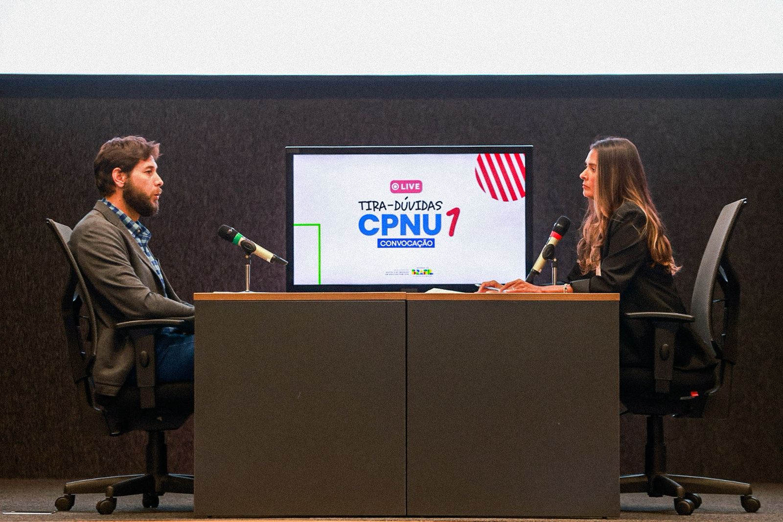 Assessor especial do MGI, Pedro Assumpção, e assessora de comunicação da pasta, Ana Guimarães, durante a live realizada na Enap. Foto: Jhonathan Braga