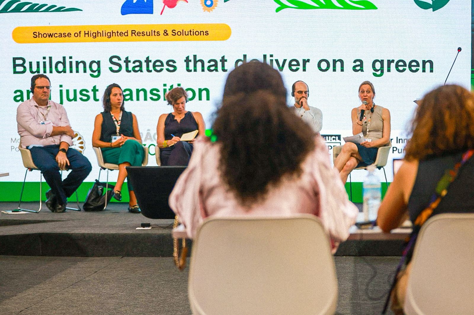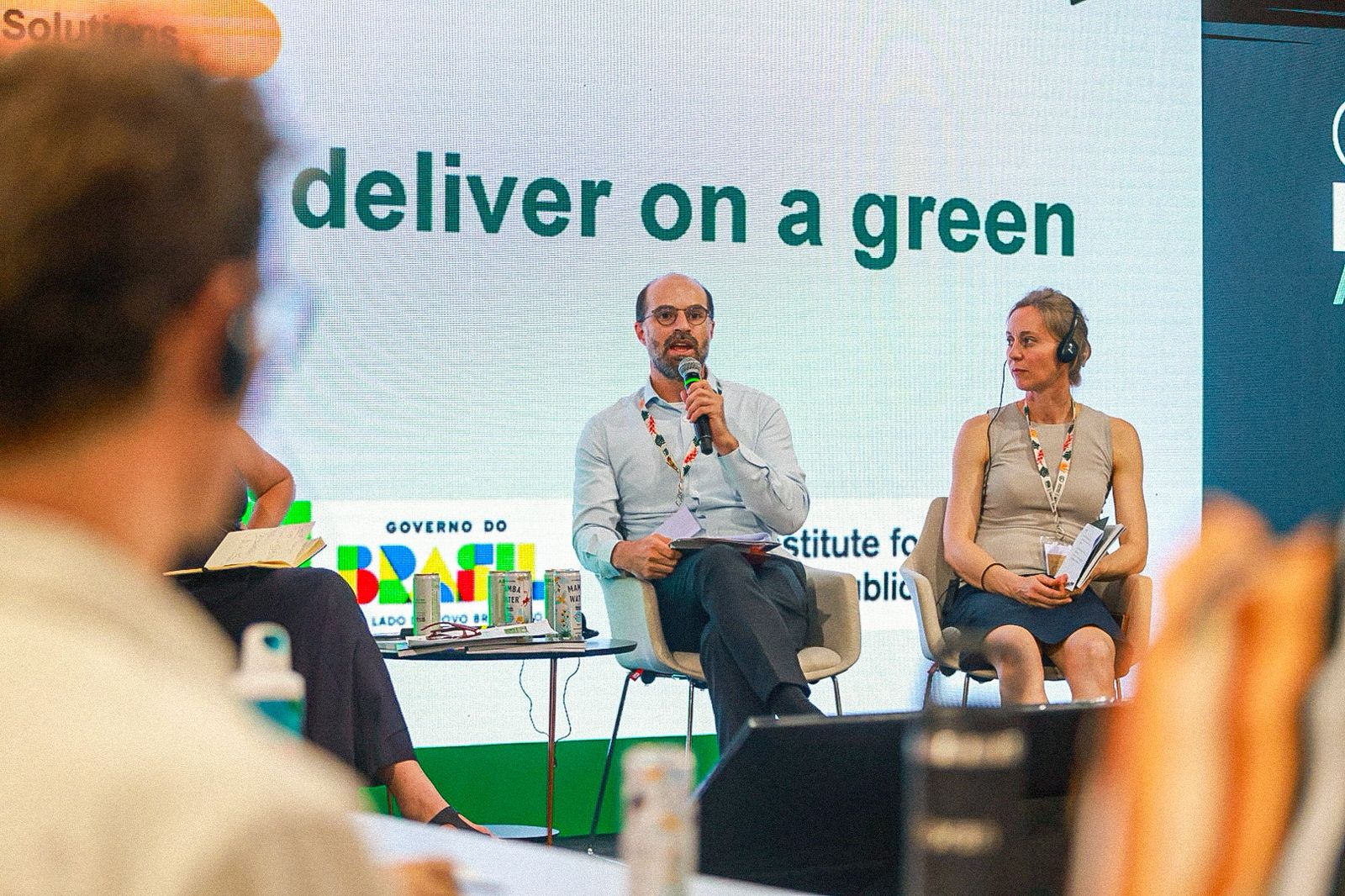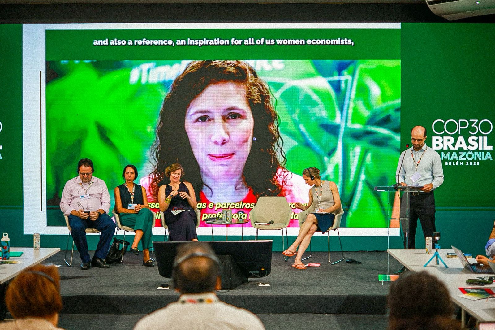 Apresentação do relatório “Capacidades estatais para um mundo verde e justo” durante a COP30, elaborado em coautoria pela ministra Esther Dweck e pela professora Mariana Mazzucato, em parceria entre o MGI e o UCL IIPP. Foto: Jhonathan Braga.