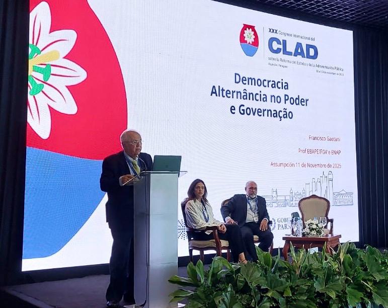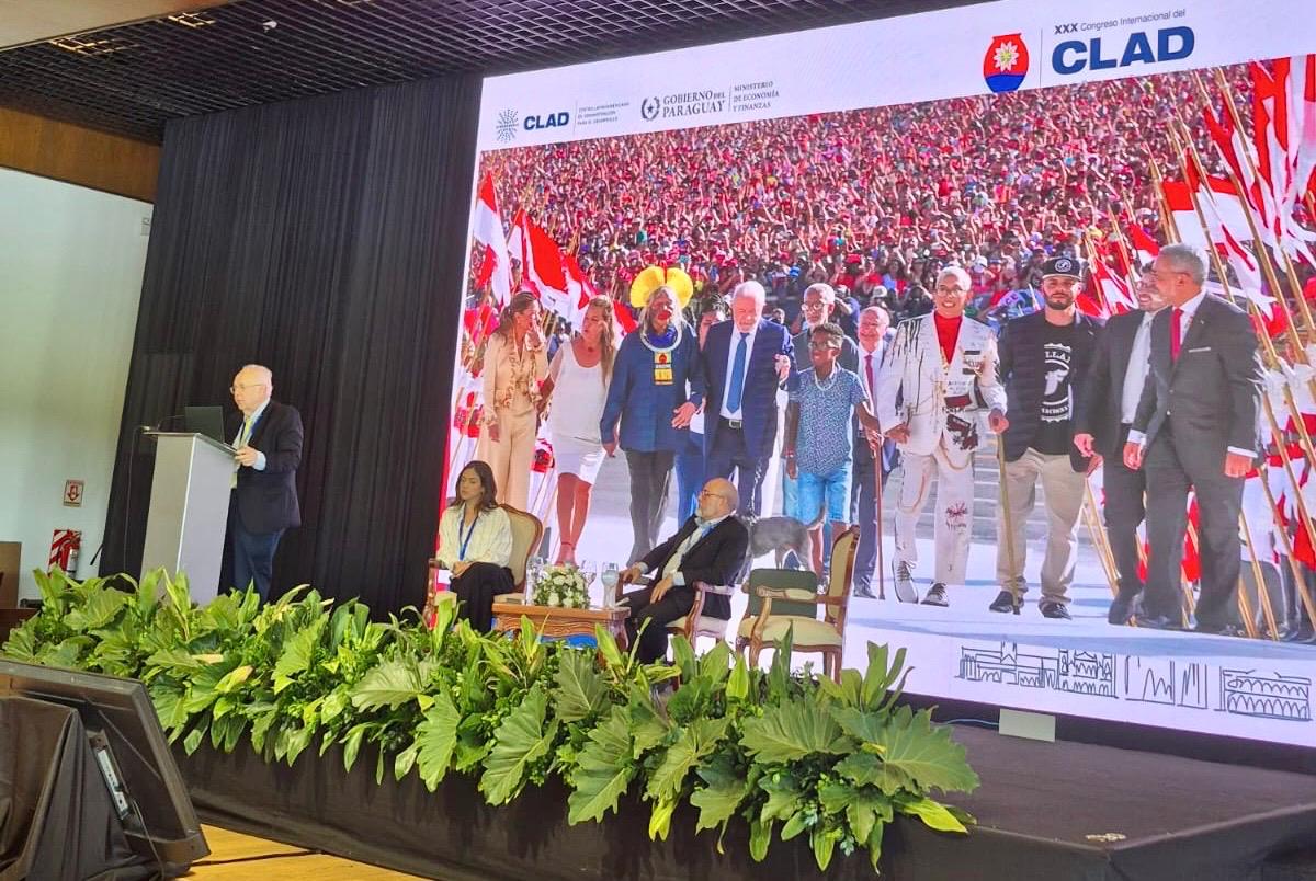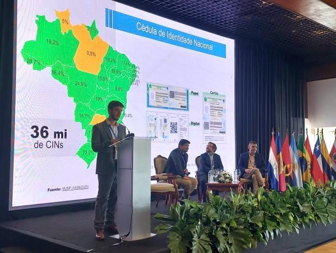 Enzo Tessarolo, chefe da Assessoria Especial de Cooperação Federativa do MGI, apresenta o trabalho “Cooperação federal para um governo digital inclusivo” durante o XXX Congresso Internacional do CLAD, em Assunção (Paraguai). Foto: Êmili Rossetti e Catarina Pinheiro/ MGI
