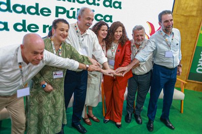 Líderes das estatais no encontro firmaram compromisso por transição justa, acompanhados da ministra da Esther Dweck e da secretária de Coordenação das Estatais do MGI, Elisa Leonel. Foto: Jhonathan Braga
