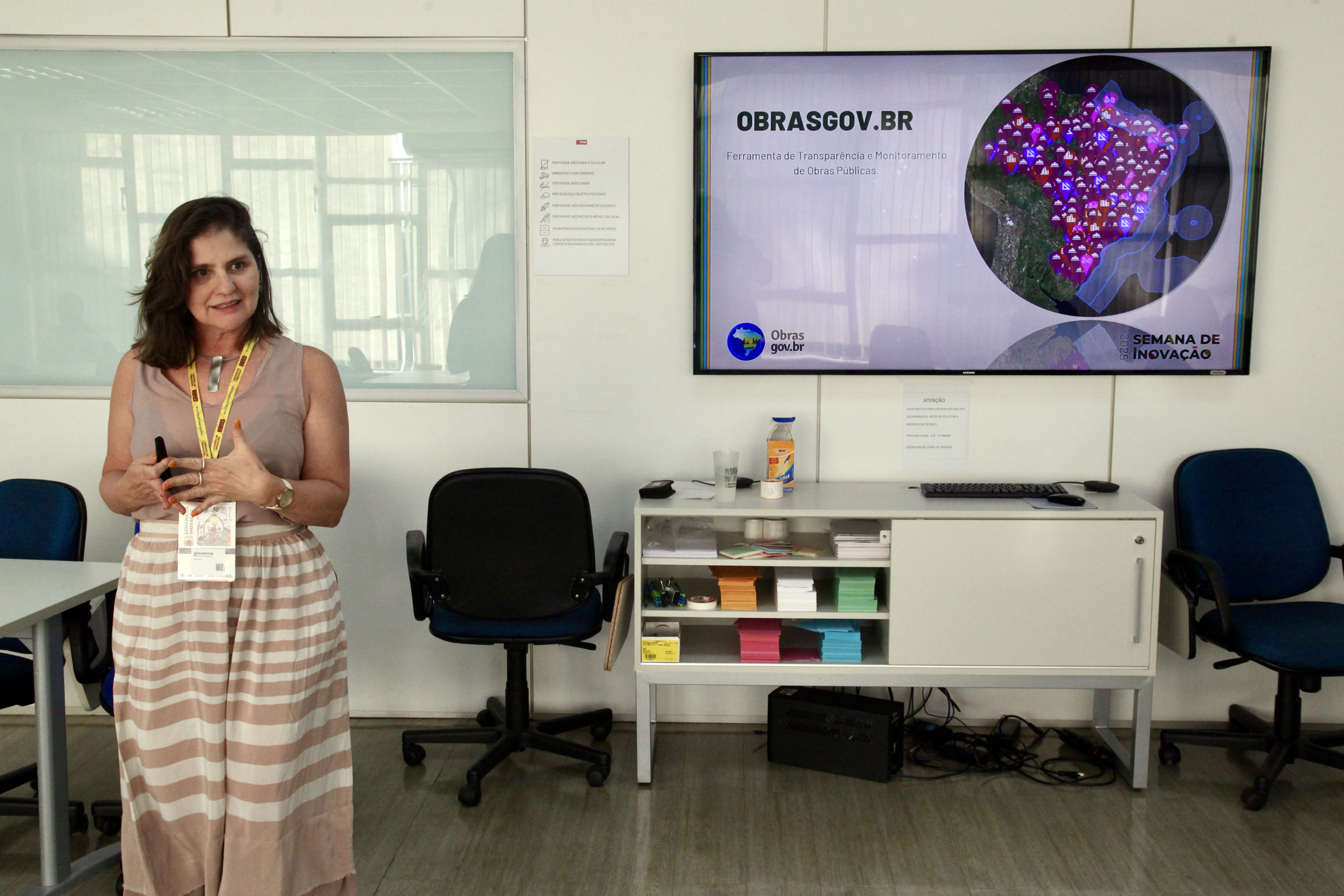 Coordenadora-geral da Seges/MGI, Giovanna Ferreira, apresentando o sistema Obrasgov.br durante a Semana de Inovação 2025 Foto: André Corrêa
