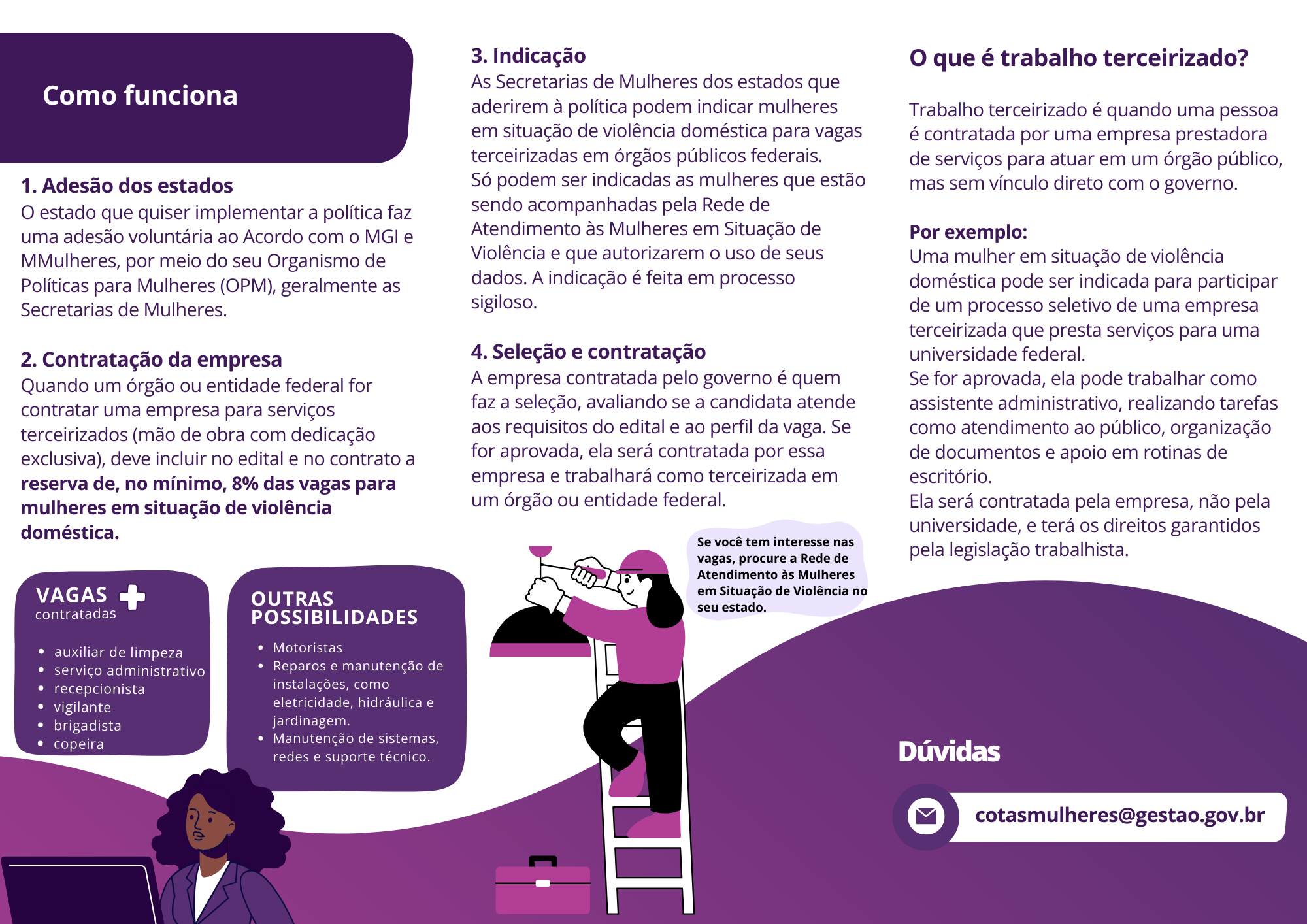 - Entes aderentes (por meio das Secretarias de Mulheres): cria, em até 90 dias após a assinatura, um cadastro sigiloso das mulheres atendidas pela rede de atendimento especializado com interesse em trabalhar como terceirizadas nos órgãos e entidades federais. É a Secretaria de Mulheres que garante que as indicadas para as vagas sejam aquelas assistidas pela Lei Maria da Penha (Lei nº 11.340/2006).