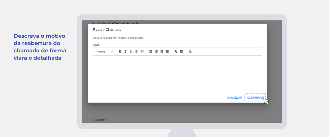 5. Preencha o campo descrição com o motivo que levou à reabertura do chamado, de forma clara e detalhada. Utilize suas próprias palavras referente ao assunto do chamado. Depois, clique em confirmar.