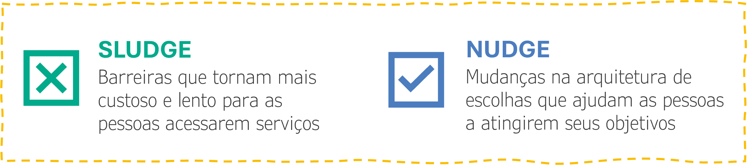 De maneira geral, os sludges estão associados a barreiras e elementos que tornam a tomada de decisões ou a realização de tarefas mais difíceis, impactando negativamente na interação de pessoas usuárias com o governo.