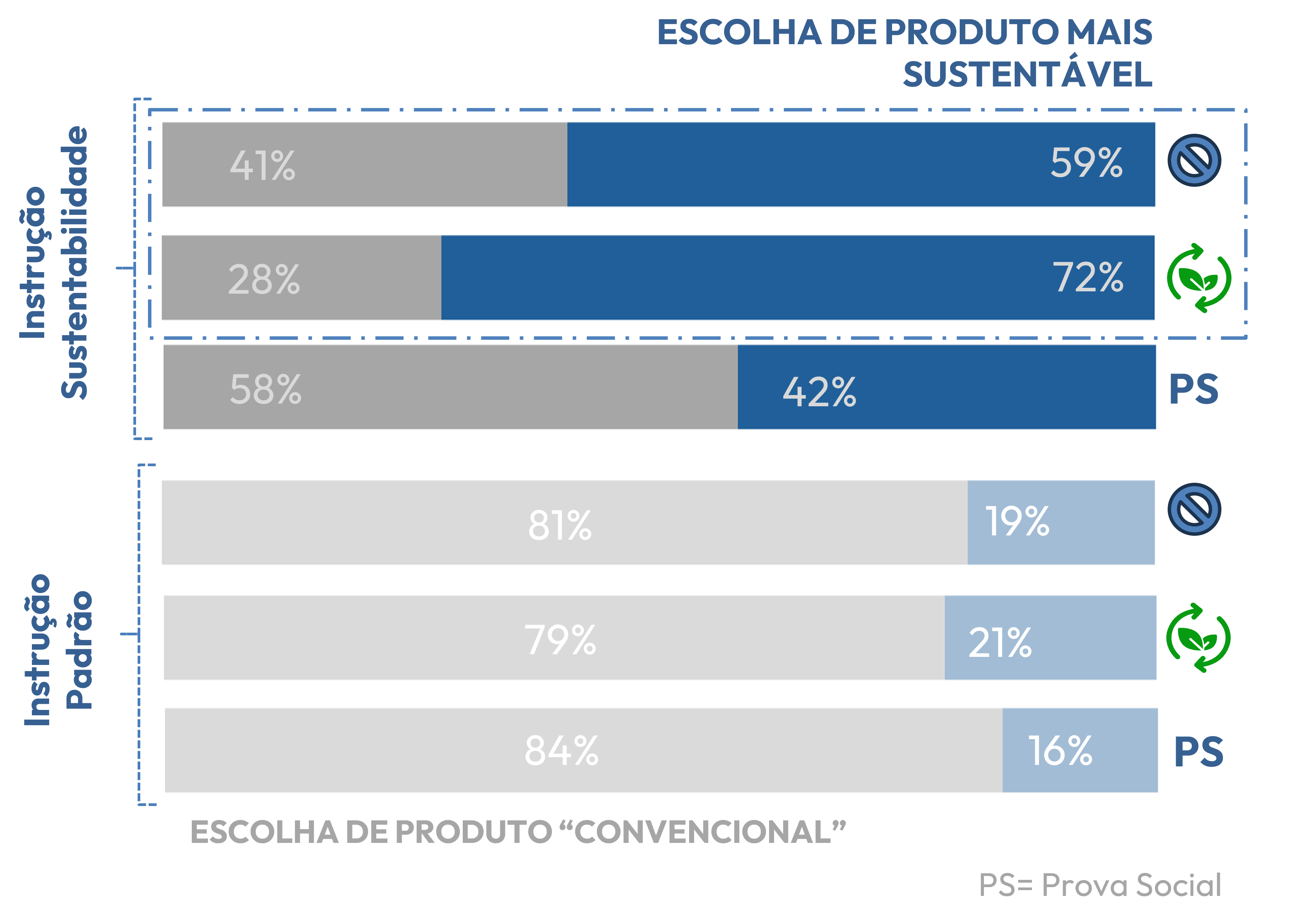 Quando a instrução da compra trouxe de forma explícita a necessidade de escolher produtos que atendessem a critérios de sustentabilidade, 59% dos compradores escolheram produtos mais sustentáveis. Na ausência dessa instrução, apenas 19% dos compradores fizeram a escolha adequada. Ao se analisar o impacto de todas as intervenções testadas, concluiu-se que as chances de os compradores escolherem os produtos mais sustentáveis aumenta em 6 vezes quando a instrução de compra é objetiva e explícita nesse sentido.