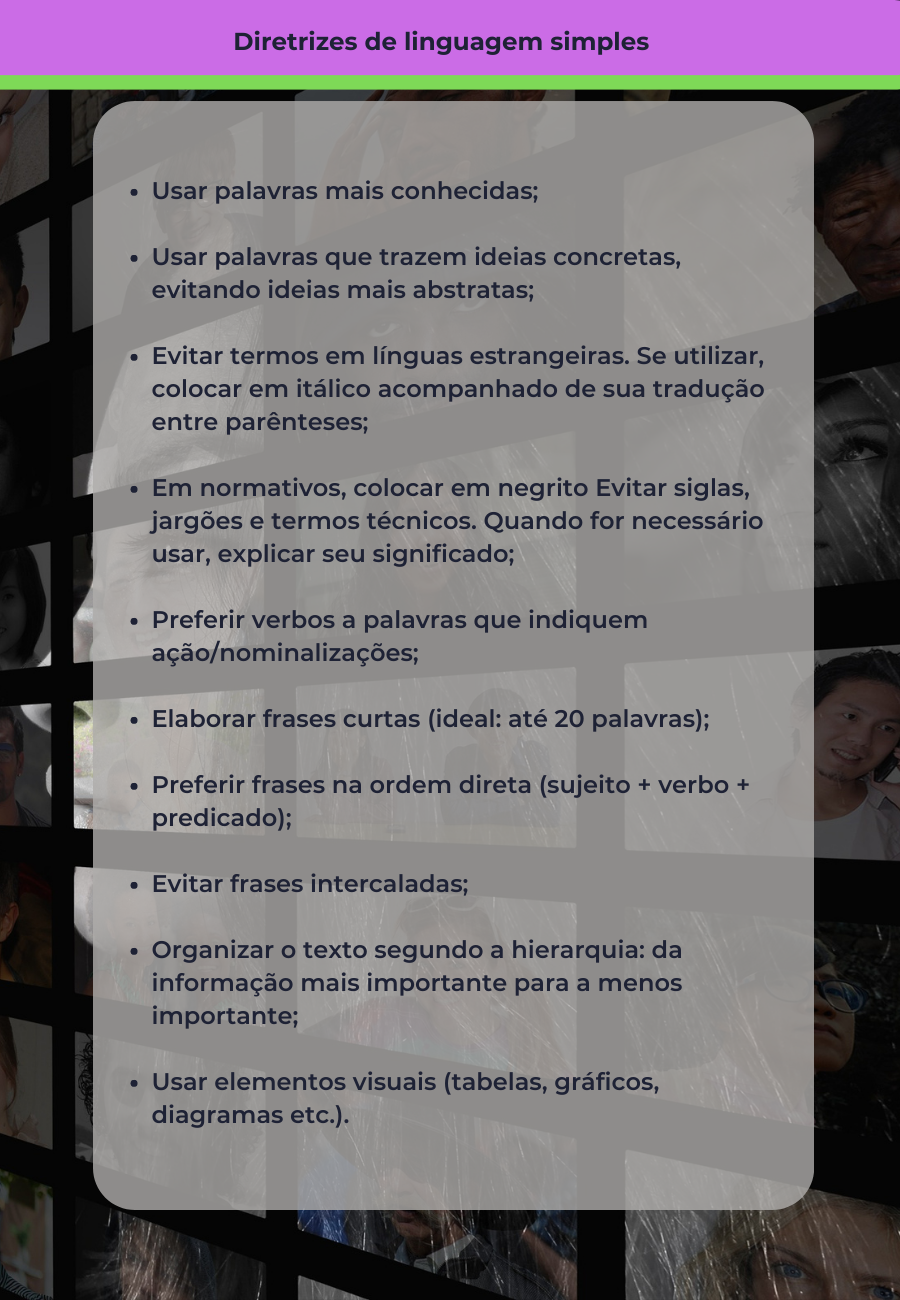 [Conteúdo acessível da imagem]: Imagem contendo as seguintes diretrizes de linguagem simples: (1) Usar palavras mais conhecidas; (2) Usar palavras que trazem ideias concretas, evitando ideias mais abstratas; (3) Evitar termos em línguas estrangeiras. Se utilizar, colocar em itálico acompanhado de sua tradução entre parênteses; (4) Em normativos, colocar em negrito Evitar siglas, jargões e termos técnicos. Quando for necessário usar, explicar seu significado; (5) Preferir verbos a palavras que indiquem ação ou nominalizações; (6) Elaborar frases curtas (ideal: até 20 palavras); (7) Preferir frases na ordem direta (sujeito + verbo + predicado); (8) Evitar frases intercaladas; (9) Organizar o texto segundo a hierarquia: da informação mais importante para a menos importante; (10) Usar elementos visuais (tabelas, gráficos, diagramas etc.). [Fim da descrição].