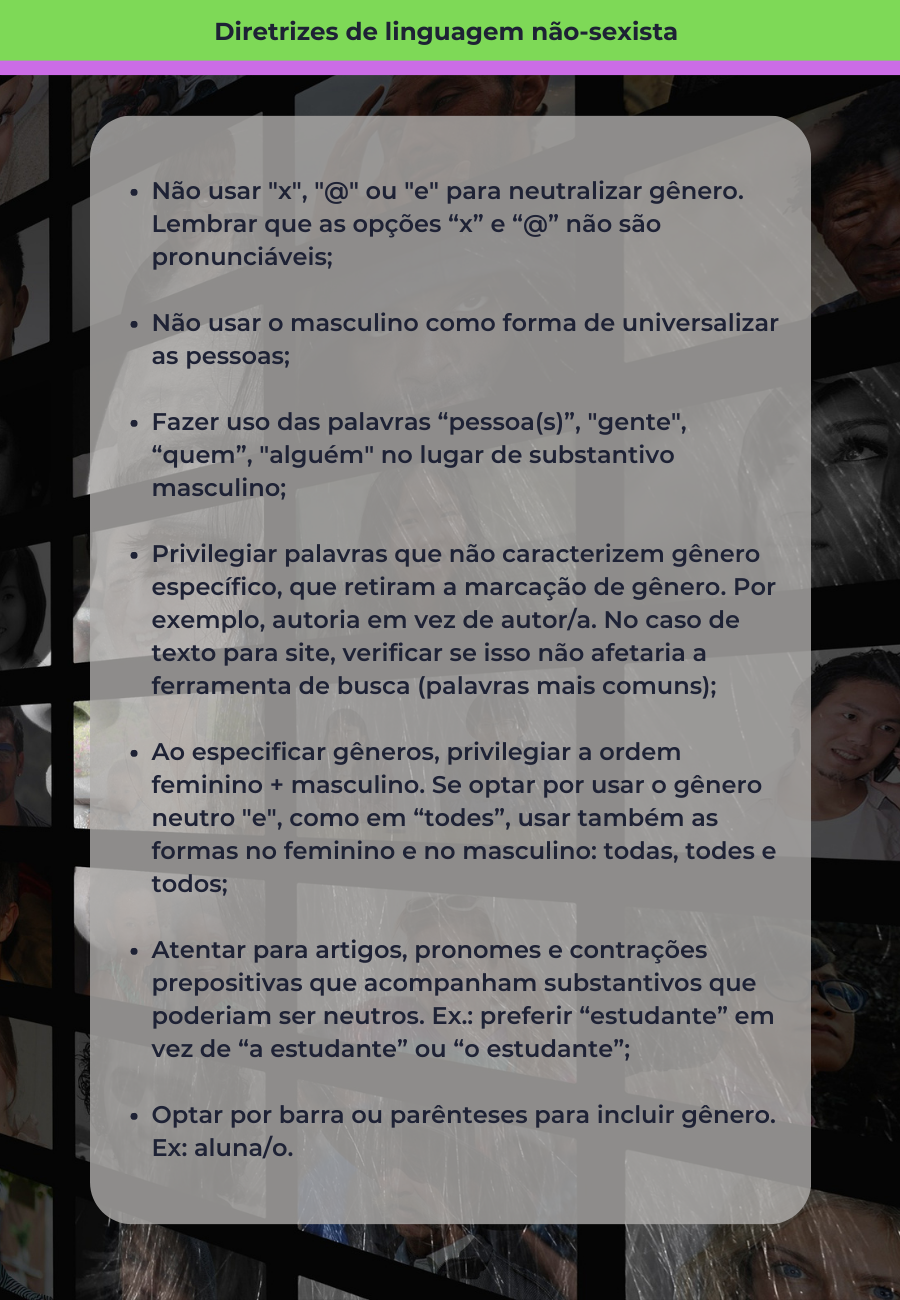 [Conteúdo acessível da imagem]: Imagem contendo as seguintes diretrizes de linguagem não-sexista: (1) Não usar "x", "@" ou "e" para neutralizar gênero. Lembrar que as opções “x” e “@” não são pronunciáveis; (2) Não usar o masculino como forma de universalizar as pessoas; (3) Fazer uso das palavras “pessoa(s)”, "gente", “quem”, "alguém" no lugar de substantivo masculino; (4) Privilegiar palavras que não caracterizem gênero específico, que retiram a marcação de gênero. Por exemplo, autoria em vez de autor/a. No caso de texto para site, verificar se isso não afetaria a ferramenta de busca (palavras mais comuns); (5) Ao especificar gêneros, privilegiar a ordem feminino + masculino. Se optar por usar o gênero neutro "e", como em “todes”, usar também as formas no feminino e no masculino: todas, todes e todos; (6) Atentar para artigos, pronomes e contrações prepositivas que acompanham substantivos que poderiam ser neutros. Ex.: preferir “estudante” em vez de “a estudante” ou “o estudante”; (7) Optar por barra ou parênteses para incluir gênero. Ex: aluna/o. [Fim da descrição].