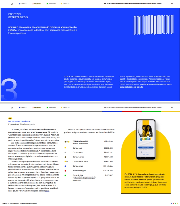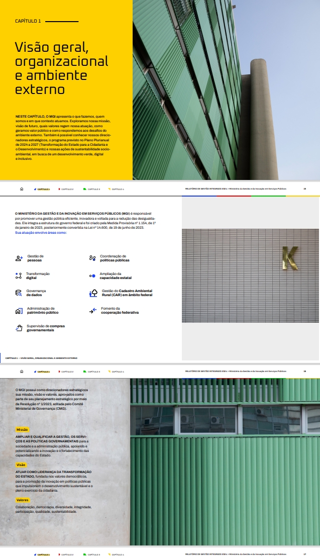 Para alcançar um público ainda mais amplo e diverso, o MGI disponibilizará um sumário executivo bilíngue e peças visuais com os principais destaques do relatório, que ficarão disponível na página de Governança, no site do MGI. Organizado em blocos temáticos e estruturado com hipertextos navegáveis, o RGI permite uma leitura fluida e dinâmica.