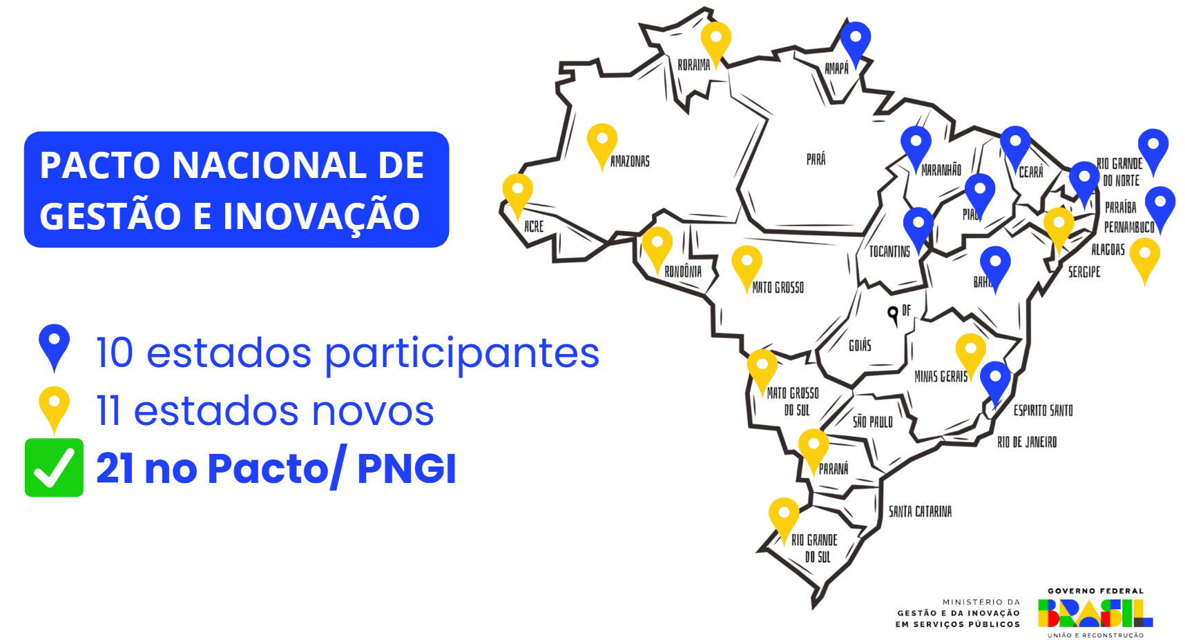 No mapa é possível visualizar os estados que já participam do PNGI (AP, BA, CE, ES, PB, PE, PI, MA, RN e TO), com marcadores em azul, e, em amarelo, as novas adesões (AC, AL, AM, MG, MT, PR, RO, RR, RS e SE)