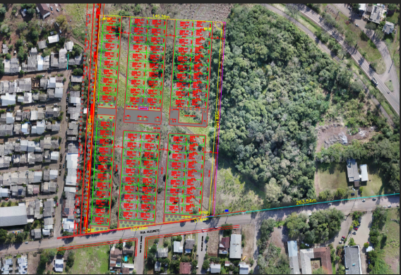 Vista aérea do terreno em Encantado, no RS, com indicação dos futuros lotes.
