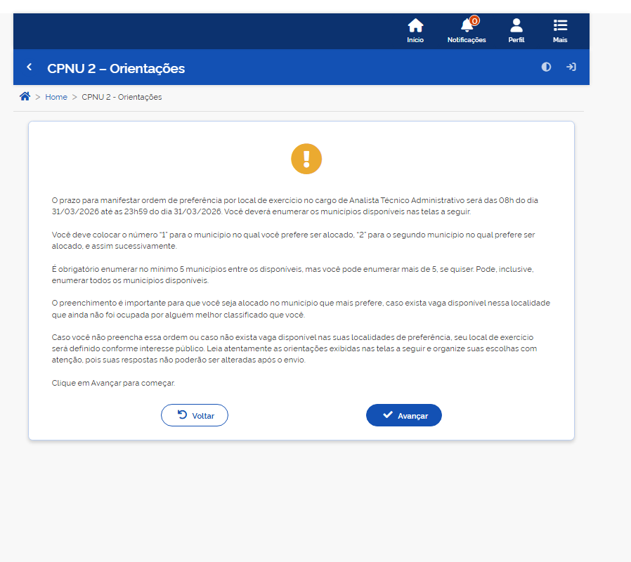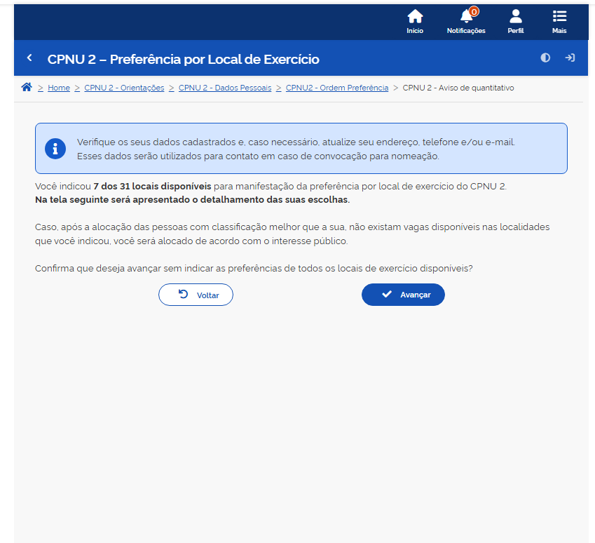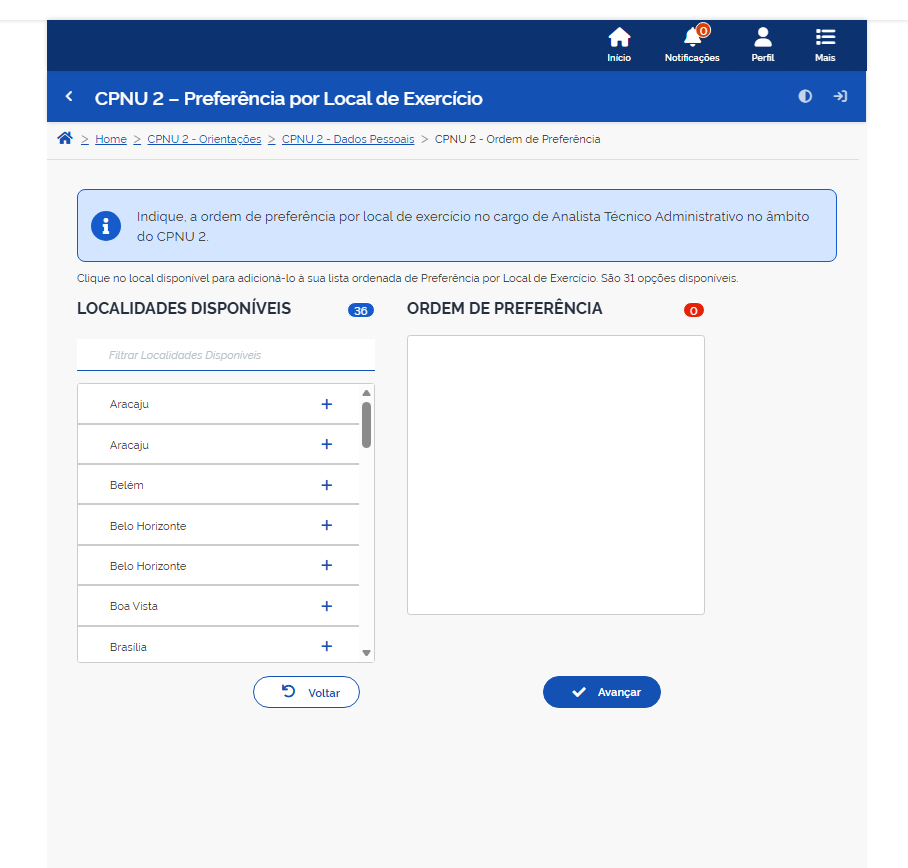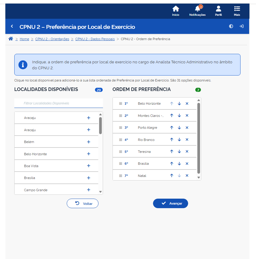 Depois da conferência dos dados, leia com atenção a tela de Preferência por Local de Exercício. Nessa etapa, deverão ser selecionados os municípios disponíveis, organizando-os em ordem de preferência. O número 1 deve ser atribuído ao município em que o candidato mais deseja ser alocado; o número 2, ao segundo município de preferência; e assim sucessivamente.