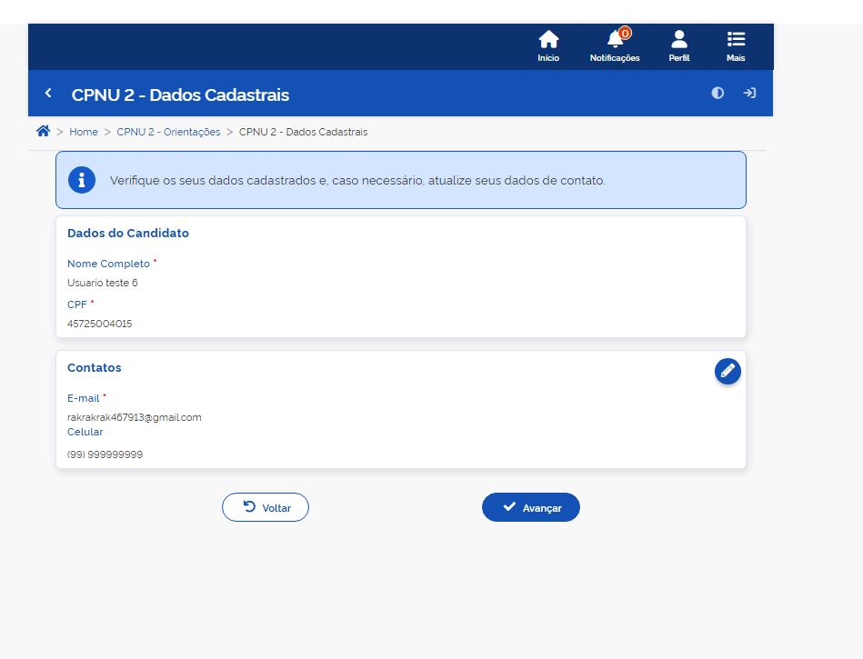 Na etapa seguinte, o sistema apresentará seus dados cadastrais. É importante conferir nome, CPF, e-mail e telefone. Caso necessário, os dados de contato deverão ser atualizados, pois poderão ser utilizados em eventual convocação para nomeação.