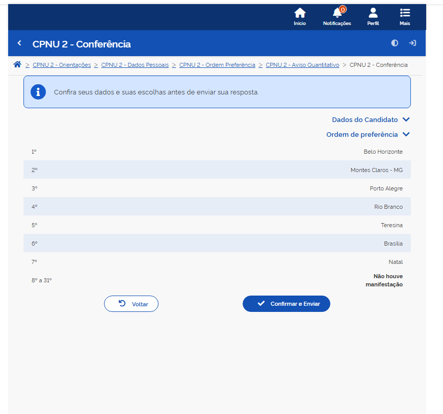 Antes do envio definitivo, será apresentada uma tela de conferência, com seus dados e a lista de localidades escolhidas na ordem indicada. Essa etapa exige atenção, porque as respostas não poderão ser alteradas após a confirmação.