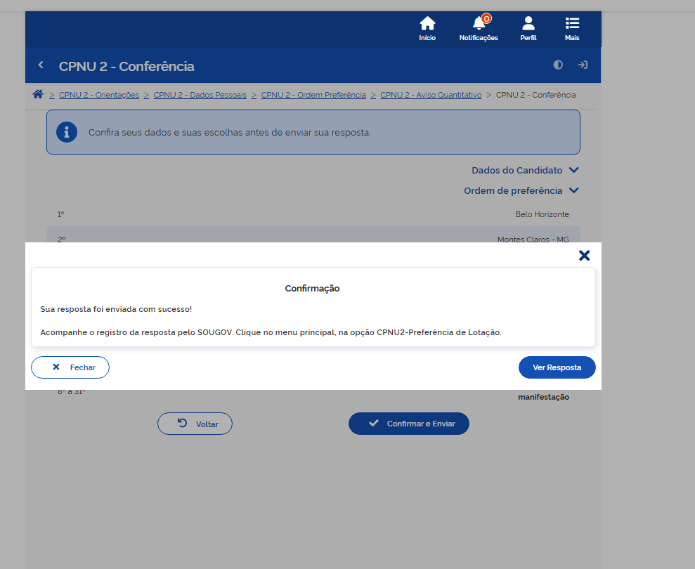 Após revisar as informações, o candidato deverá clicar em Confirmar e Enviar. Em seguida, o sistema exibirá a mensagem de confirmação de que a resposta foi enviada com sucesso. O registro poderá ser acompanhado posteriormente pelo próprio SouGov.br, no menu do CPNU 2.