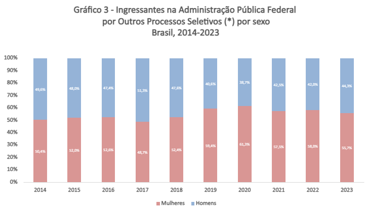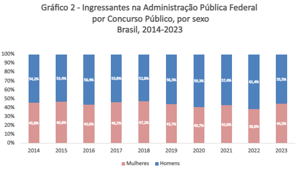 Entretanto, quando se considera apenas o ingresso por meio de Concurso Público, observou-se o predomínio da participação masculina em todo o período considerado (2014-2023). Ou seja, uma proporção maior de homens (56,1%, em média) teve mais oportunidades de ocupar um posto de trabalho estável e de melhor qualidade na Administração Pública Federal (APF).
