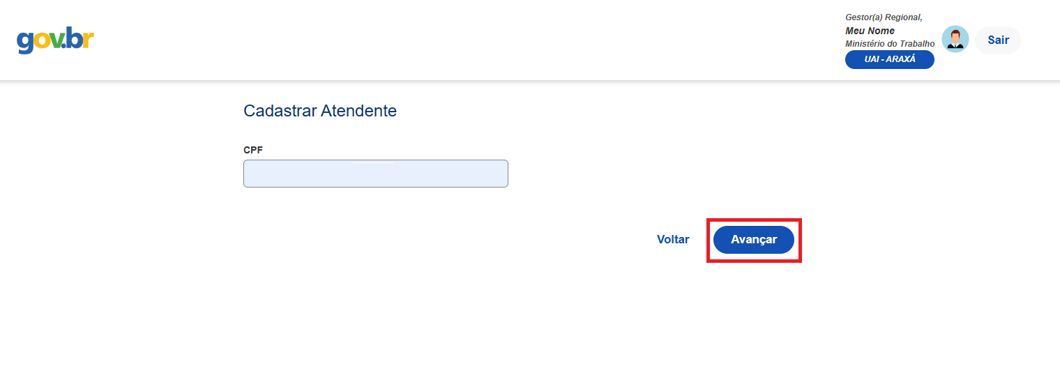 Informe o CPF do atendente que deseja cadastrar e clique em “Avançar”.
