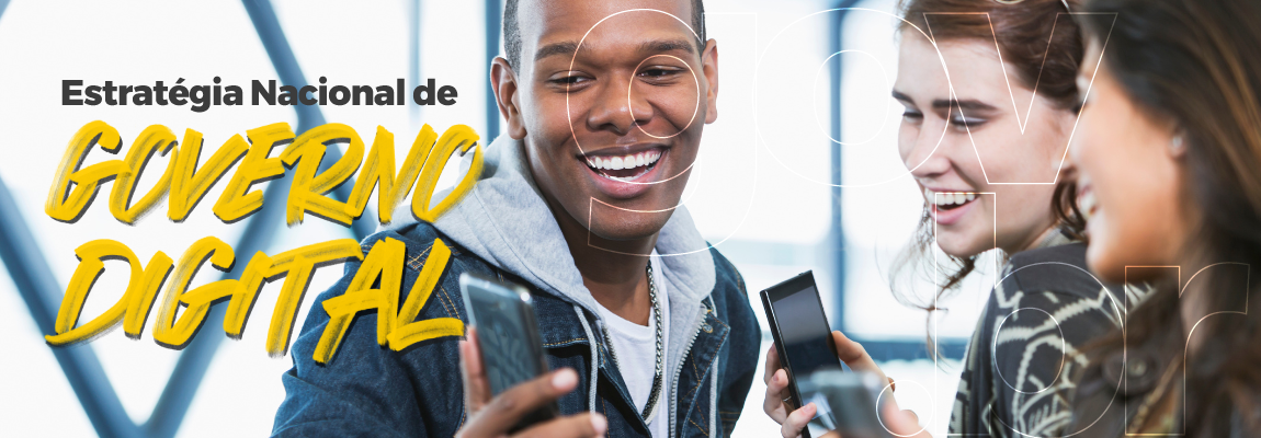 Três jovens (um rapaz e duas moças) sorriem. Eles estão olhando para a tela de celulares. Texto: Estratégia Nacional de Governo Digital. A logo do GOV.BR está em relevo na imagem.