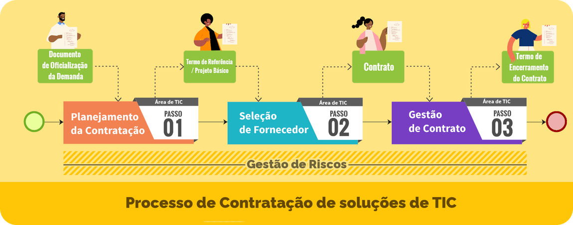 O processo de contratação de soluções de TIC é composto por 3 fases sequenciais: Planejamento da Contratação, Seleção do Fornecedor e a Gestão do Contrato, e em paralelo a estas fases ocorre o Gerenciamento de Riscos.