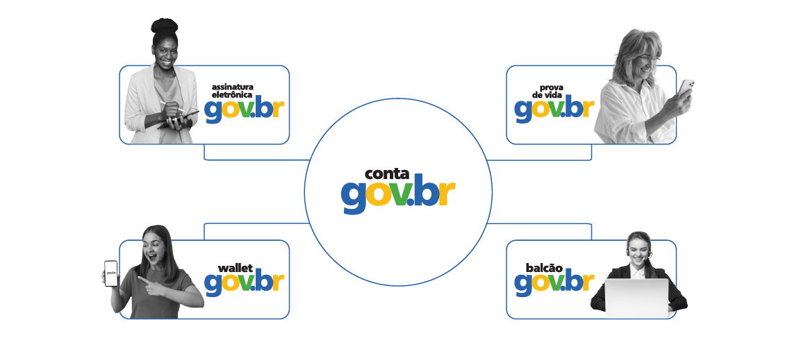 Ilustração do ecossistema, tem um circulo no centro com o texto: conta gov.br, também há quatro retângulos, um em cada extremidade. O primeiro no canto esquerdo, tem uma mulher sorrindo com um tablet na mão e o seguinte texto: assinatura eletrônica gov.br. O segundo no canto direito, tem uma mulher idosa olhando para o celular e sorrindo, e o seguinte texto: prova de vida gov.br. O terceiro no canto esquerdo, abaixo do primeiro, tem uma mulher sorrindo e apontando para o celular, e o seguinte texto: wallet gov.br. O quarto no cato direito, abaixo do segundo, tem uma mulher sorrindo utilizando o notebook e o seguinte texto: balcão gov.br.