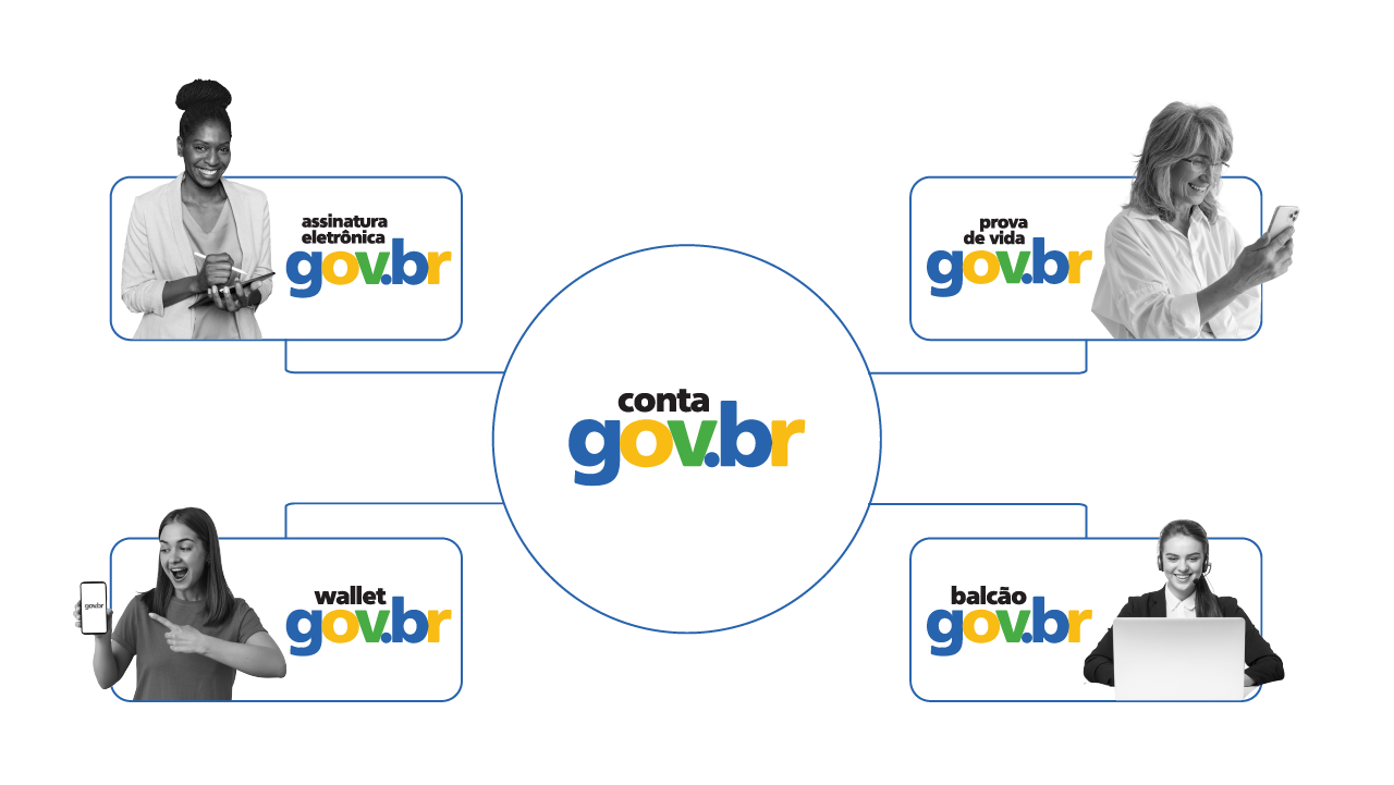 Ilustração do ecossistema, tem um circulo no centro com o texto: conta gov.br, também há quatro retângulos, um em cada extremidade. O primeiro no canto esquerdo, tem uma mulher sorrindo com um tablet na mão e o seguinte texto: assinatura eletrônica gov.br. O segundo no canto direito, tem uma mulher idosa olhando para o celular e sorrindo, e o seguinte texto: prova de vida gov.br. O terceiro no canto esquerdo, abaixo do primeiro, tem uma mulher sorrindo e apontando para o celular, e o seguinte texto: wallet gov.br. O quarto no cato direito, abaixo do segundo, tem uma mulher sorrindo utilizando o notebook e o seguinte texto: balcão gov.br.