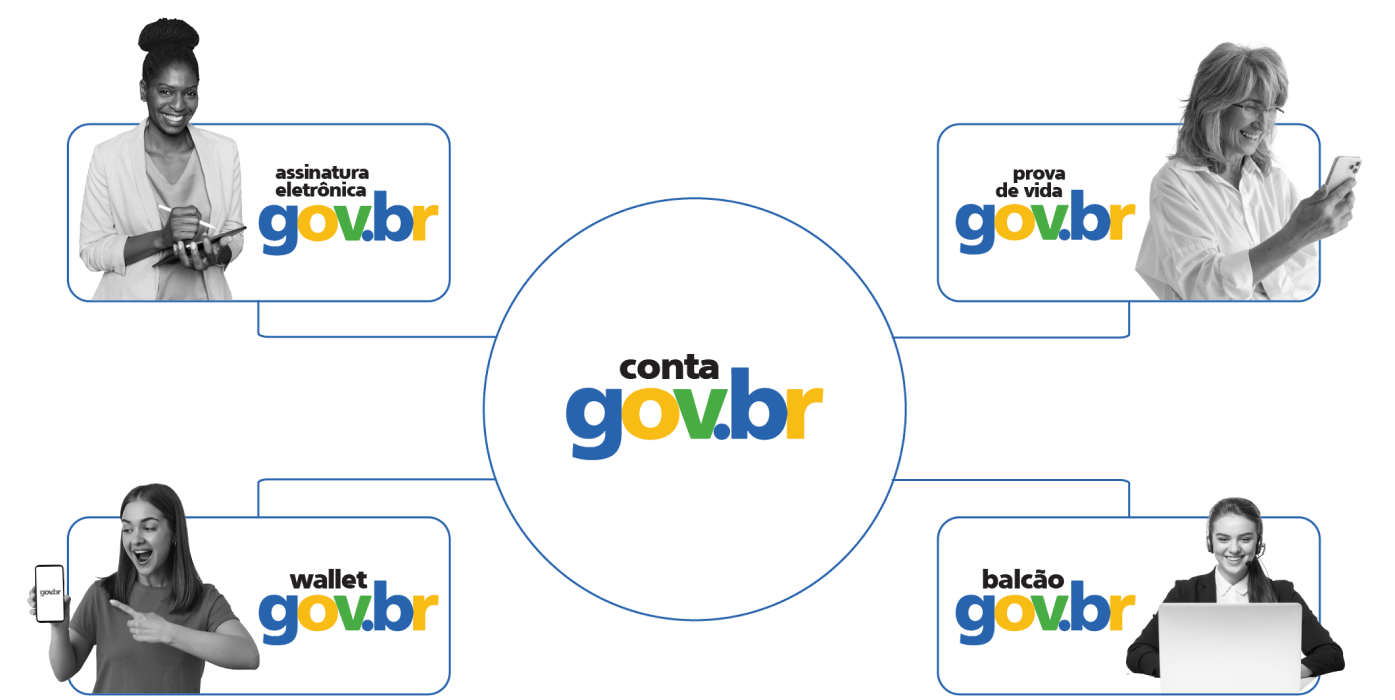 Ilustração do ecossistema, tem um circulo no centro com o texto: conta gov.br, também há quatro retângulos, um em cada extremidade. O primeiro no canto esquerdo, tem uma mulher sorrindo com um tablet na mão e o seguinte texto: assinatura eletrônica gov.br. O segundo no canto direito, tem uma mulher idosa olhando para o celular e sorrindo, e o seguinte texto: prova de vida gov.br. O terceiro no canto esquerdo, abaixo do primeiro, tem uma mulher sorrindo e apontando para o celular, e o seguinte texto: wallet gov.br. O quarto no cato direito, abaixo do segundo, tem uma mulher sorrindo utilizando o notebook e o seguinte texto: balcão gov.br.